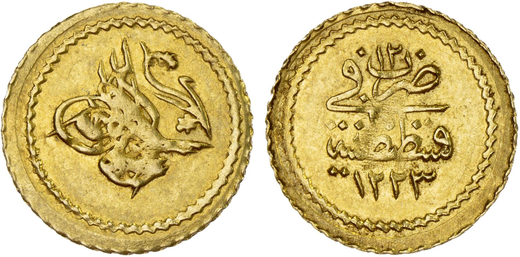TURKEY: Mahmud II, 1808-1839, AV rubiye (0.81g), Kostantaniye, AH1223 year 12, KM-608, lovely and lustrous, Unc. The rubiye ("quarter") is 1/4 of the sultani (findik), which was struck to the standard of about 3.50g until reduced to 3.20g under Mustafa IV. Thus this rubiye is exactly 1/4 of the reduced sultani. It is not 1/4 of the zeri mahbub, which weighed about 2.60g, even though this classification has been almost universal in the KM and other catalogs. The rubiye may also be called 1/4 sultani, 1/4 findik, or 1/4 eshrefi (three more different terms for the same denomination).