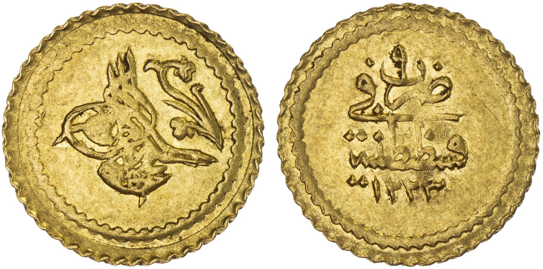 TURKEY: Mahmud II, 1808-1839, AV rubiye (0.82g), Kostantaniye, AH1223 year 9, KM-608, attractive and lustrous, Unc. The rubiye ("quarter") is 1/4 of the sultani (findik), which was struck to the standard of about 3.50g until reduced to 3.20g under Mustafa IV. Thus this rubiye is exactly 1/4 of the reduced sultani. It is not 1/4 of the zeri mahbub, which weighed about 2.60g, even though this classification has been almost universal in the KM and other catalogs. The rubiye may also be called 1/4 sultani, 1/4 findik, or 1/4 eshrefi (three more different terms for the same denomination).