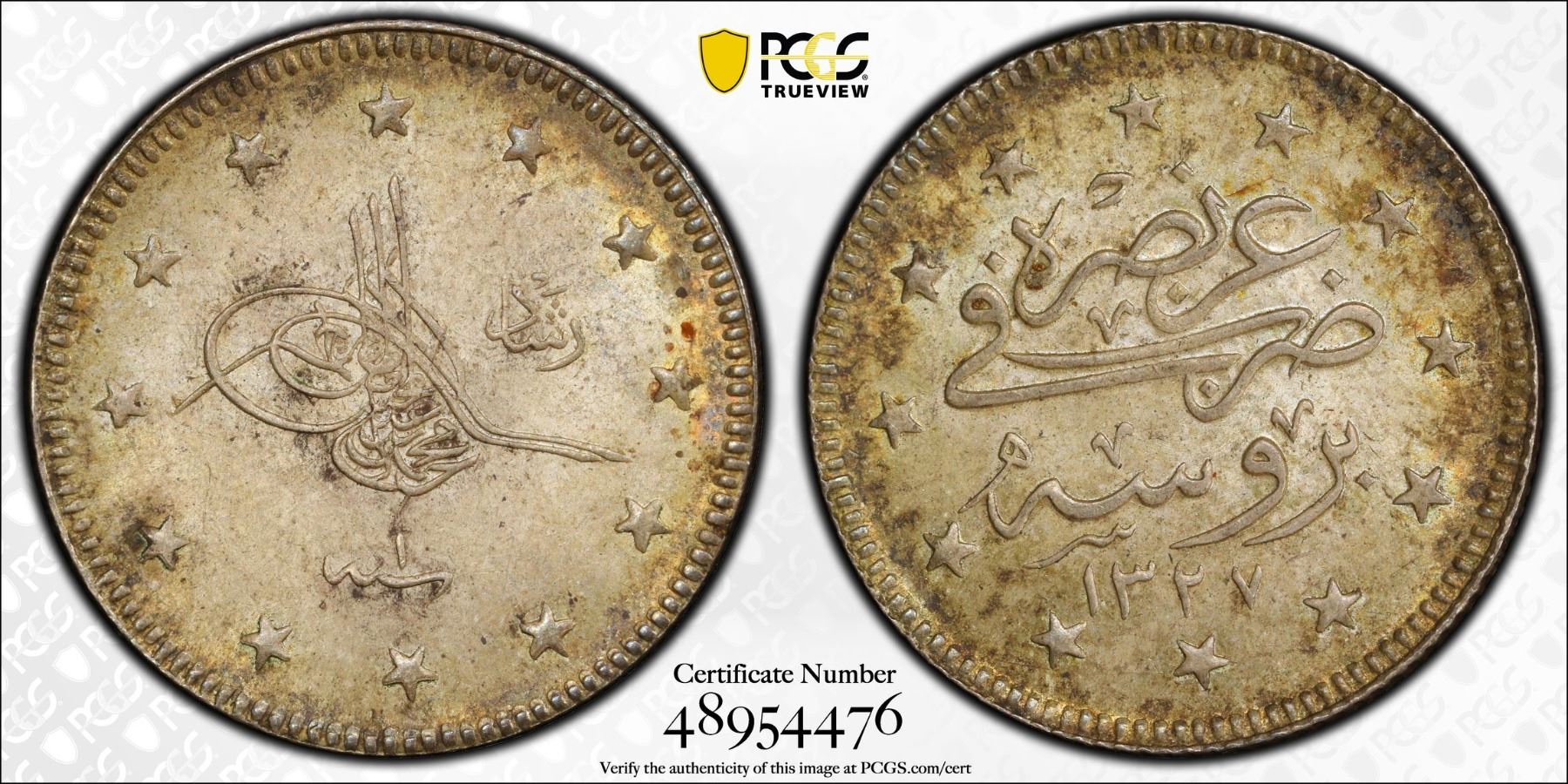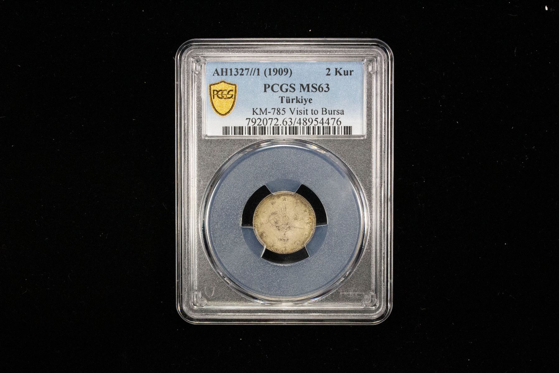 OTTOMAN: TURKEY: Mehmet V, 1909-1918, AR 2 kurush, Bursa, AH1327 year 1, PCGS MS63