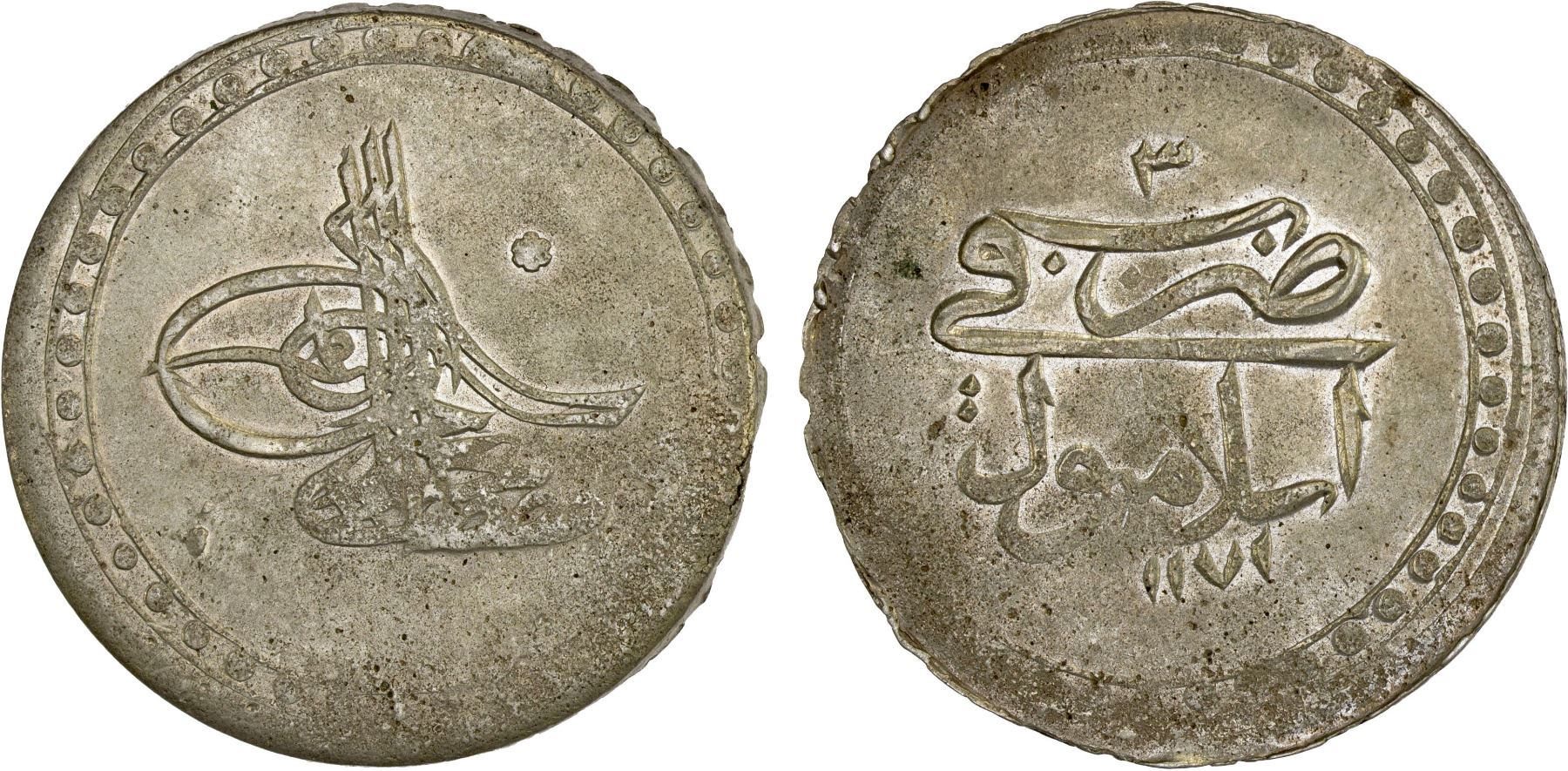 OTTOMAN: TURKEY: Mustafa III, 1757-1774, AR kurush, Islambul, AH1171 year 3, AU