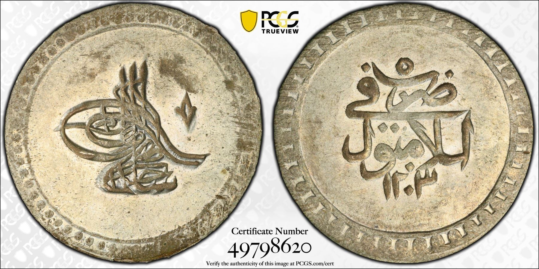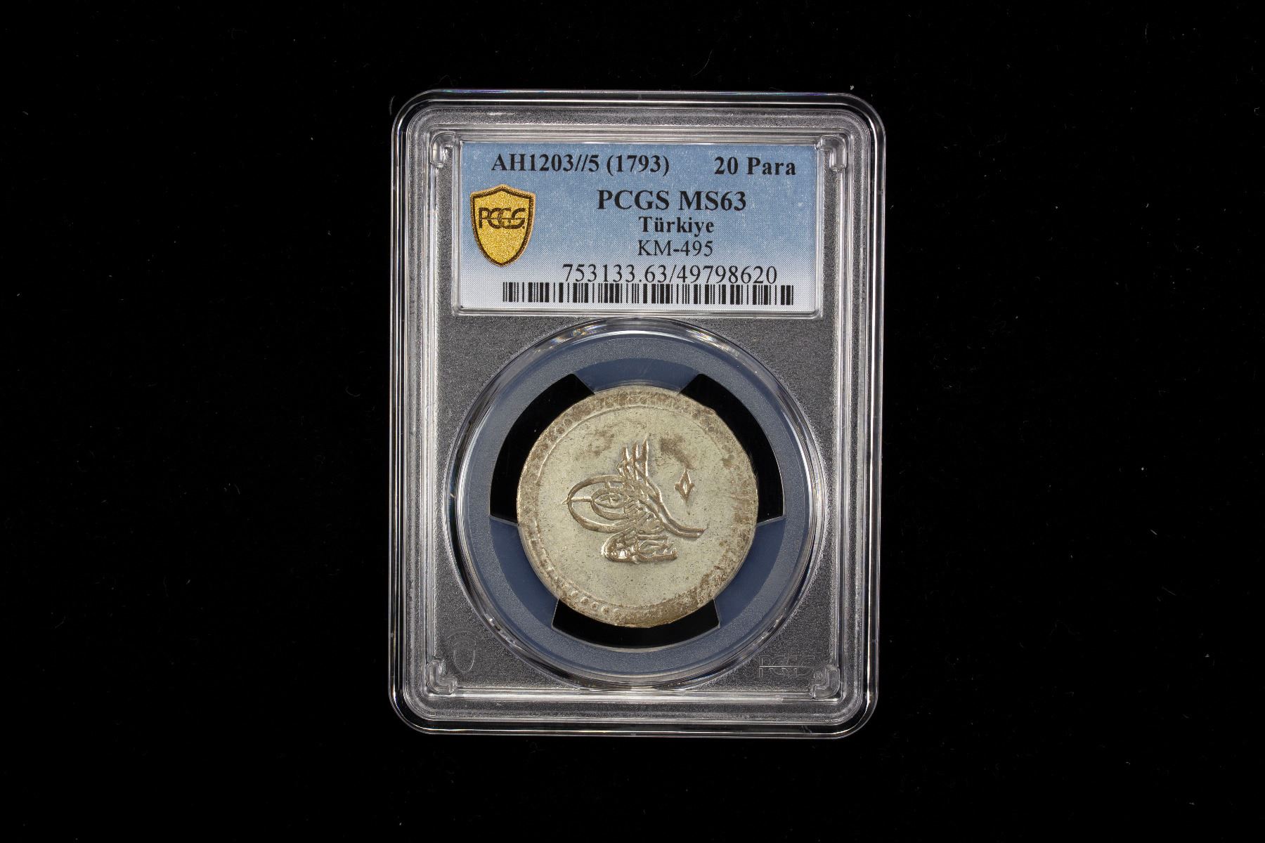 TURKEY: Selim III, 1789-1807, AR 20 para, Islambul, AH1203 year 5 (1793), KM-495, a lovely lustrous mint state example! PCGS graded MS63. Part of a small group of 7 coins of this accessional date and regnal year purchased by Maj. Fred S. Pridmore in Cyprus in the 1960s.