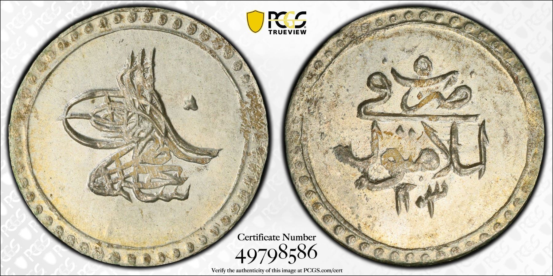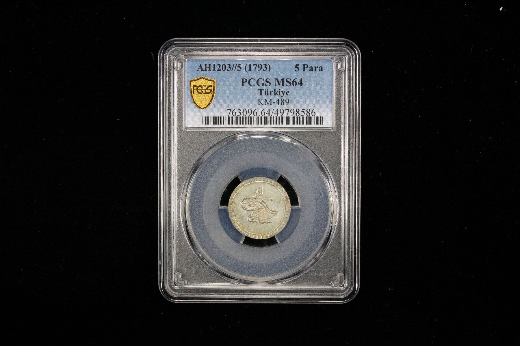 TURKEY: Selim III, 1789-1807, AR 5 para, Islambul, AH1203 year 5 (1793), KM-489, a wonderful lustrous mint state example! PCGS graded MS64. Part of a small group of 18 coins of this accessional date and regnal year purchased by Maj. Fred S. Pridmore in Cyprus in the 1960s.