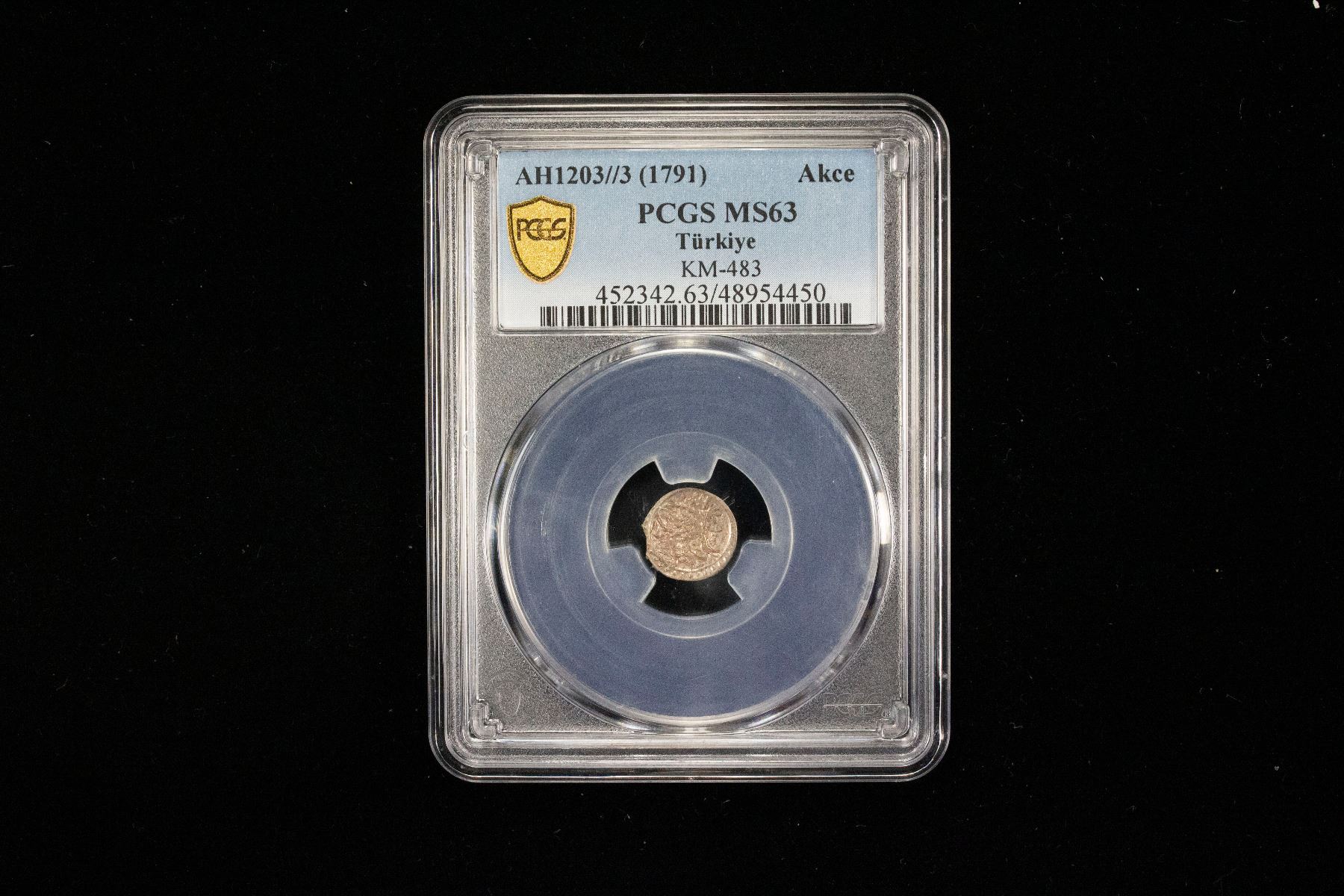TURKEY: Selim III, 1789-1807, AR akçe, Islambul, AH1203 year 3, KM-483, a lovely lustrous mint state example! PCGS graded MS63. Usual partial brockage or 'ghosting' error of obverse due to the thin planchets used for this denomination.