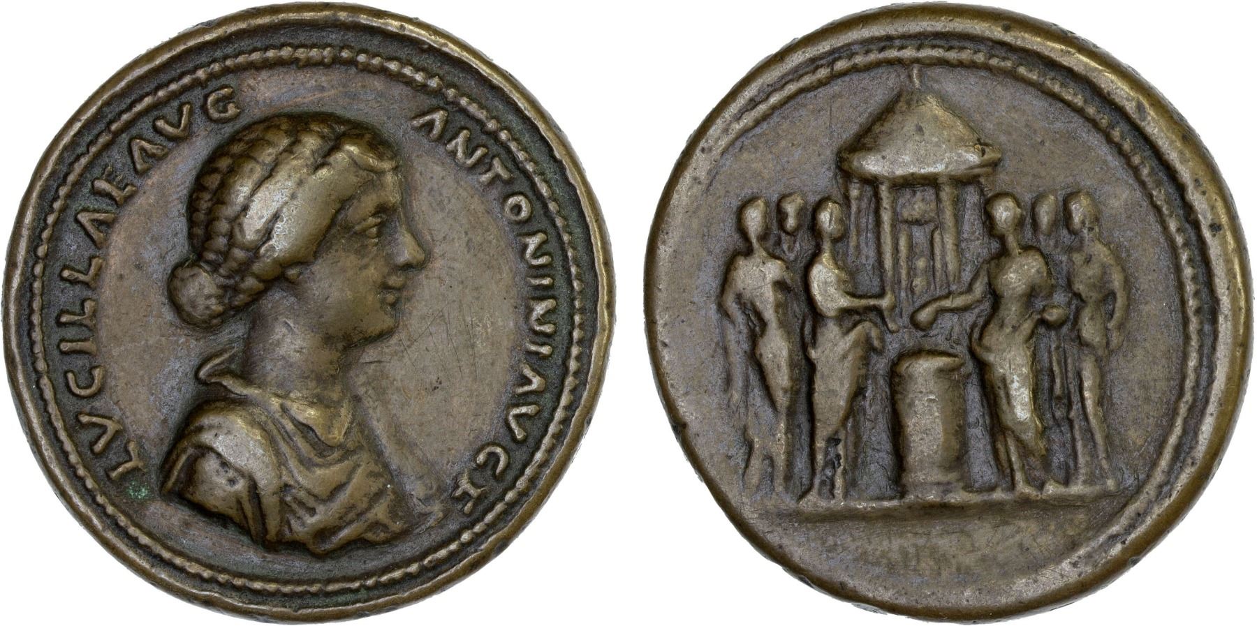 PADUAN & LATER IMITATIONS, ROMAN EMPIRE: Lucilla, augusta, 164-169, cast AE 'medallion' (25.94g), ca. 19th century, cf. Gnecchi-13, later casting of Paduan-style medallion, draped bust right, LVCILLAE AVG ANTONINI AVG F // six Vestal Virgins standing around altar, two of them offer sacrifice over flames, the Temple of Vesta in background, smoothing, VF.