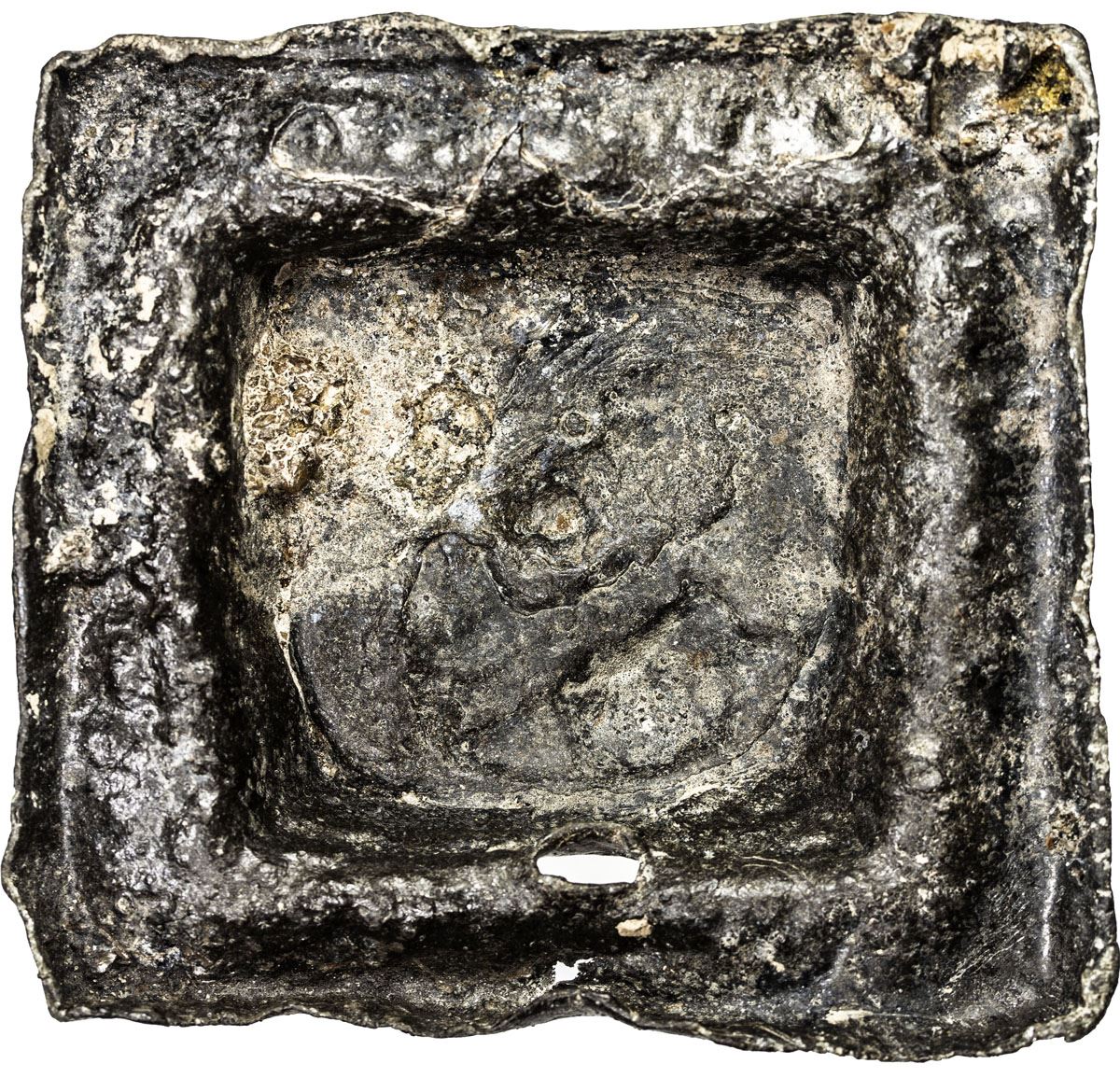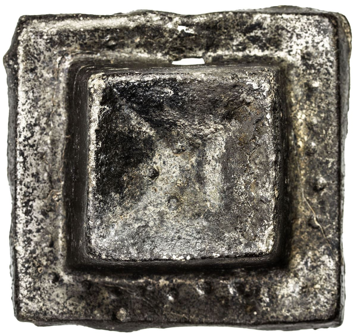 PAHANG: Anonymous, probably 19th century, tin tampang (312.14g), ND, SS-—, Prid-—, 84x80mm; a line of dots on each side of the plinth, 4 dots on the crown of the pyramid, plain reverse, naturally prepared with a hole, VF, RR.    Probably valued at 1/16 of a Spanish/Mexican 8 reales.