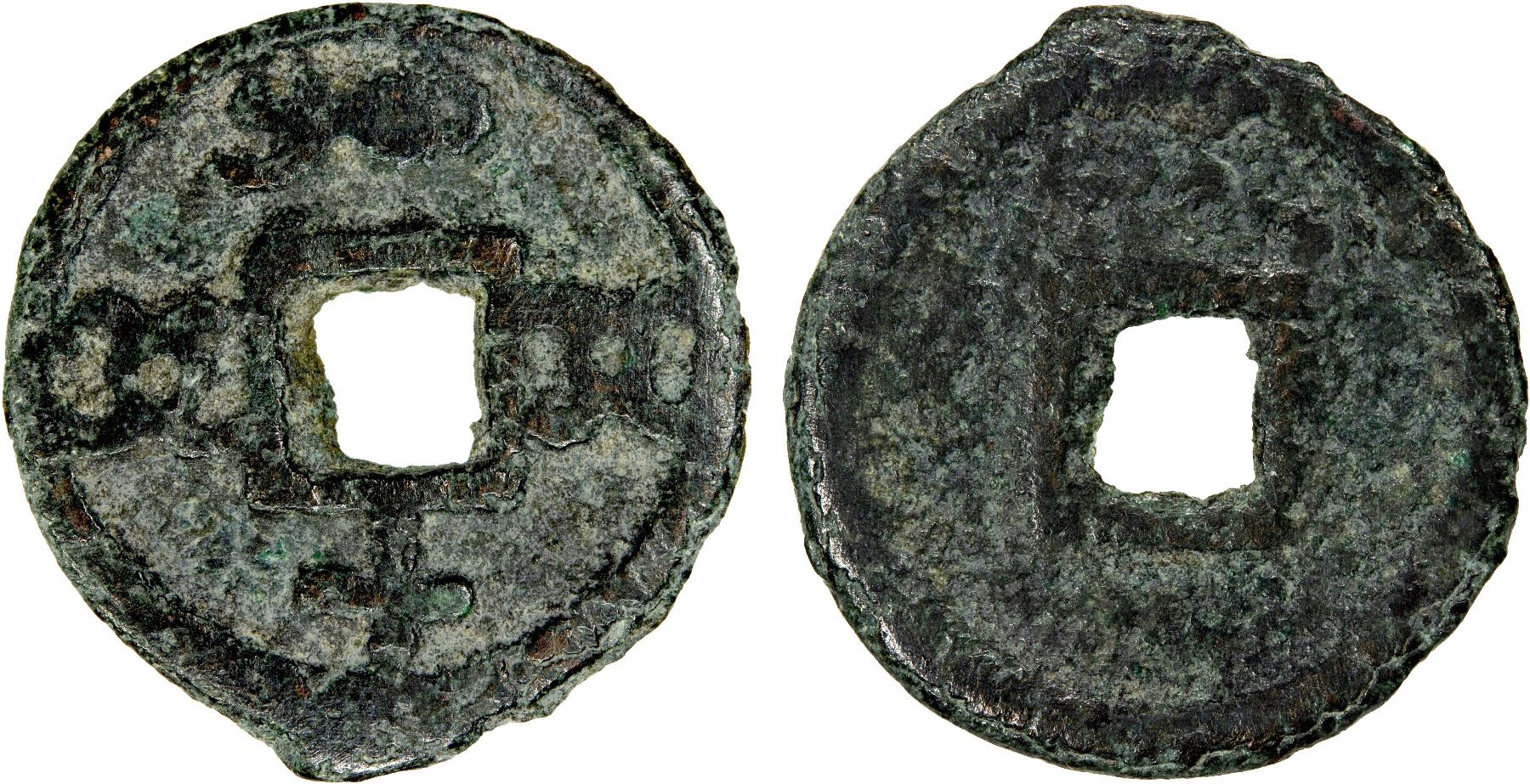 PAIKEND: Anonymous, ca. 640-710, AE cash (1.33g), Zeimal-15, Zeno-30858, two tamghas of Bukhara, "10" in Chinese below, Sogdian PNY ("money") above, uniface, nearly VF, RR. A similar example was sold in our Auction 42, Lot 101.