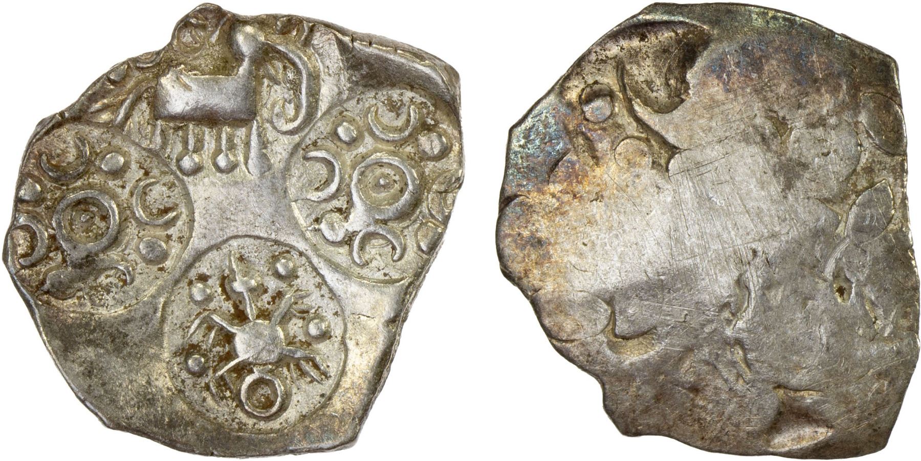 PAINGANGA: Anonymous, ca. 500-400 BC, AR ½ karshapana (1.59g), Ra-, 4 punches: elephant right, 4 crescents & pellets around annulet with dot in center (cf. R-195 for similar with 5 crescents) (twice), and peculiar critter (R-) (type B1), squarish flan, superb example, choice XF. Painganga was located to the southwest of Nagpur.
