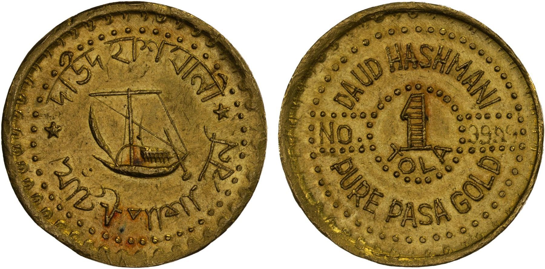 PAKISTAN: AV tola (11.65g), ND, 25.6mm private issue, Bengali (Bangla) inscription around dhow sailing left // DAUD HASHMANI / PURE PASA GOLD in outer legend, "No. 9999" either side of central circle with "1 / TOLA" within, likely issued in the 1940's-50's, AU, ex Syed Rabbi Collection.