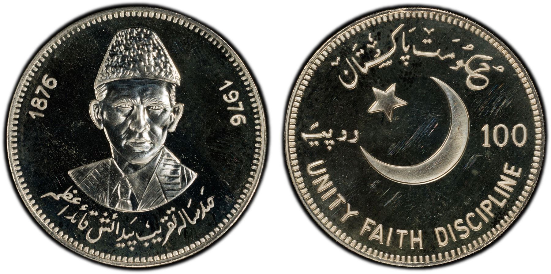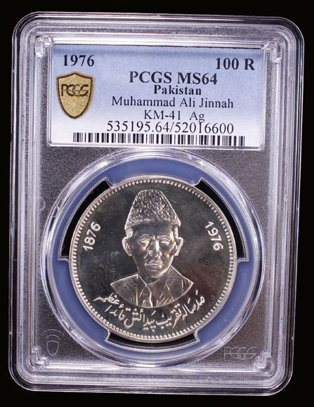 PAKISTAN: Islamic Republic, AR 100 rupees, 1976, KM-41, 100th Anniversary of the Birth of Mohammad Ali Jinnah, PCGS graded MS64.
