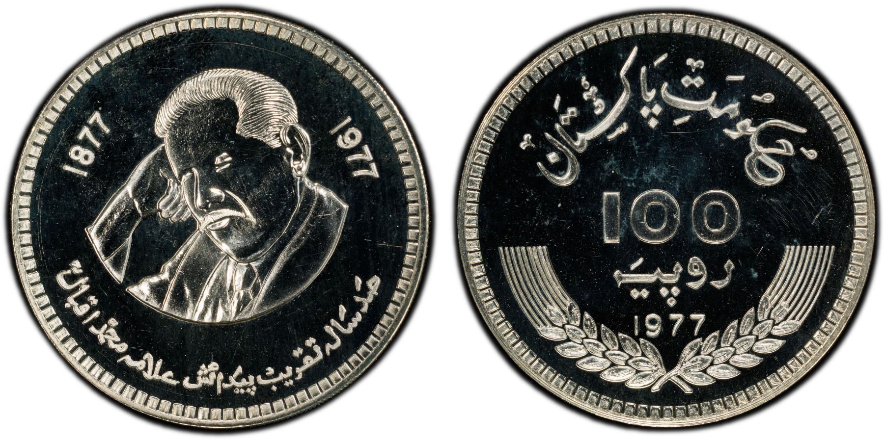 PAKISTAN: Islamic Republic, AR 100 rupees, 1977, KM-48, 100th Anniversary of the Birth of Allama Mohammad Iqbal, PCGS graded MS66.