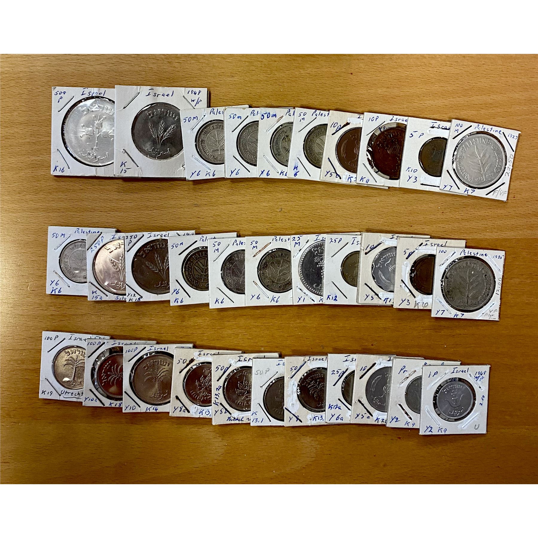 PALESTINE AND ISRAEL: LOT of 32 coins, including: Palestine: 50 mils:1927 KM-6, 1931, 1933, 1934, 1935, 1939, 1940, and 1942; and 100 mils: 1927 KM-7 and 1935; and Israel: 25 mils: JE 5709 (1949) KM-8 closed link; pruta: JE5709 (1949) with pearl KM-9 and JE5709 (1949) without pearl; 5 pruta: (1949) with pearl KM-10 and (1949) without pearl; 10 pruta: (1949) with pearl KM-11 (1952) KM-17 (1957) KM-20; and (1957) KM-20a; 25 pruta: (1949) without pearl KM-12; and (1954) KM-12a; 50 pruta: (1949) without pearl KM-13.1 and (1954); and (1954) KM-13.2a (2 pieces); 100 pruta: (1955) KM-14 (1954) KM-18; and (1954) KM-19; 250 pruta: (1949) with pearl KM-15 and (1949) without pearl; and (1949)-H KM-15a; and 500 pruta: (1949) 500 pruta KM-16; average circulated grades, with some better, and some Uncs; retail value $550, lot of 32 coins.