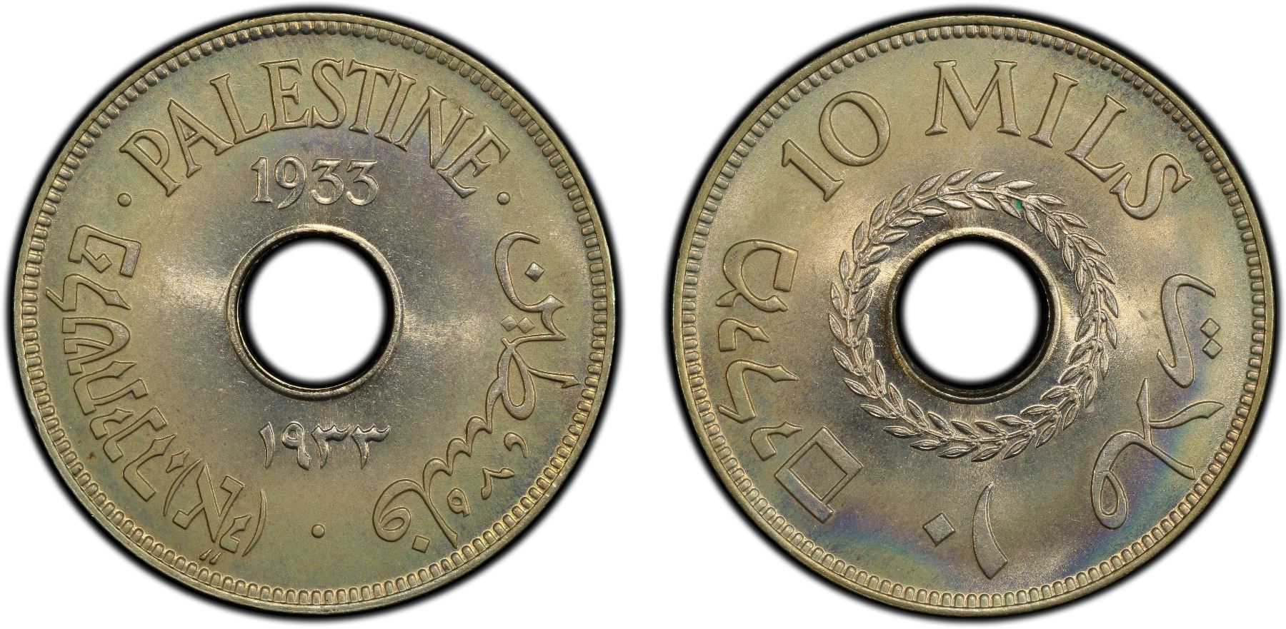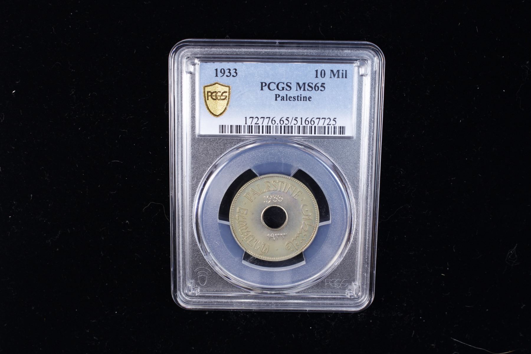 PALESTINE: British Mandate, 10 mils, 1933, KM-4, struck at the British Royal Mint, a superb lustrous example for this rare date! PCGS graded MS65. Tied for 'top pop' at PCGS for finest known example!
