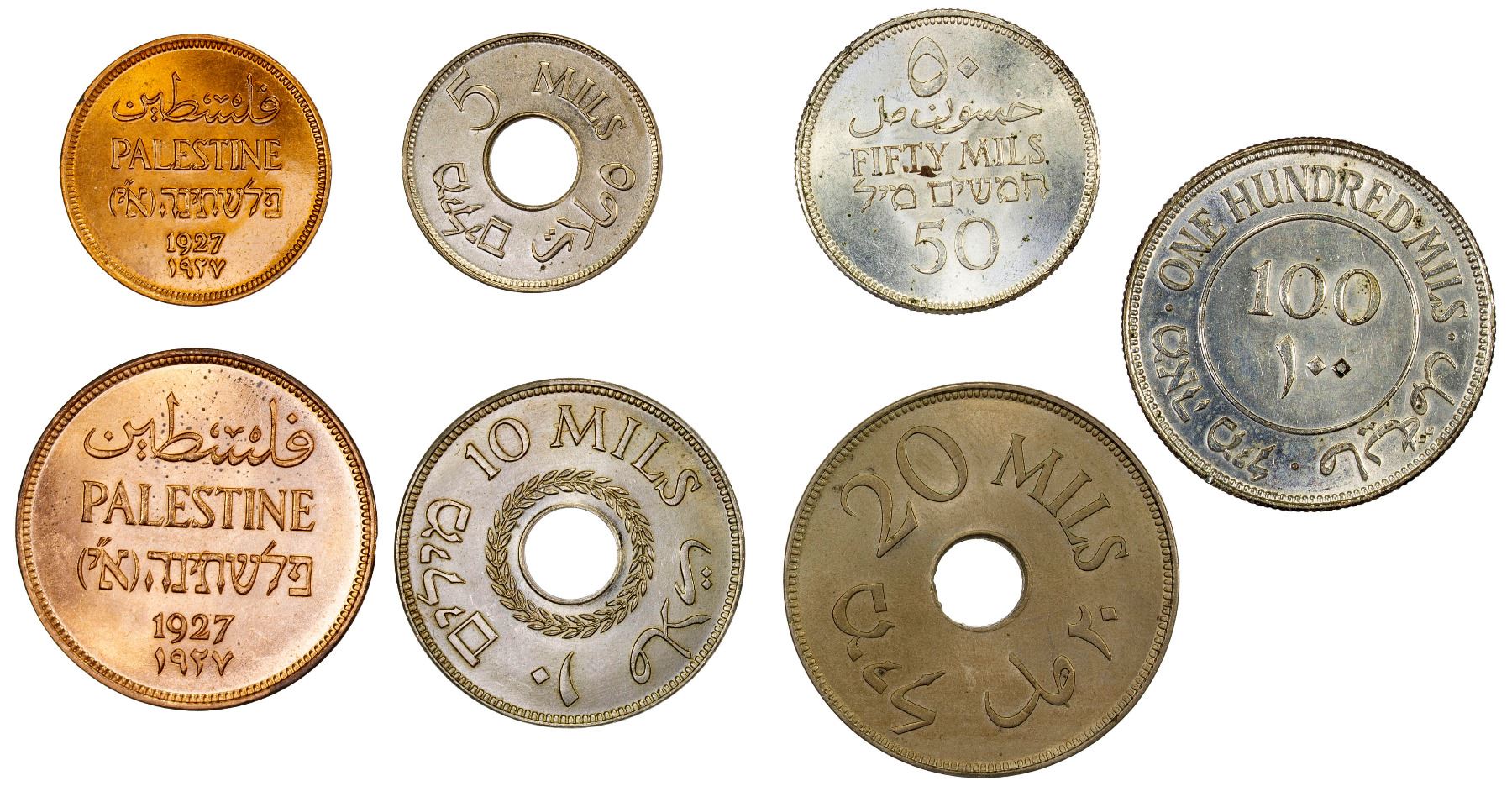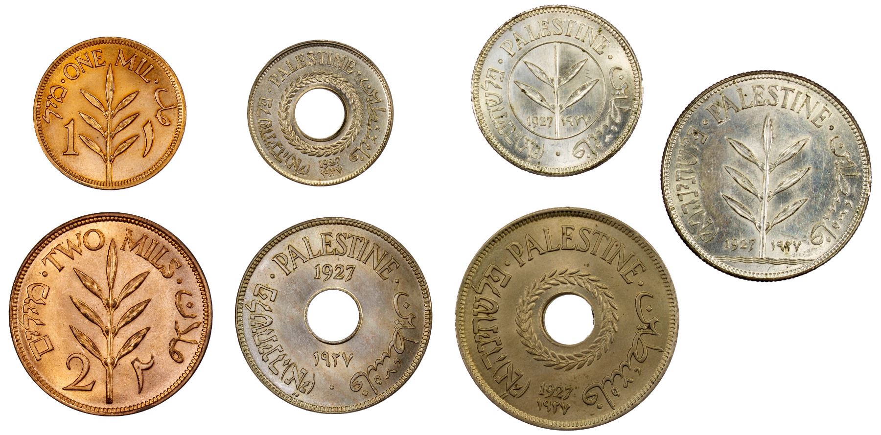 PALESTINE: British Mandate, 7-coin set, 1927, including 1, 2, 5, 10, 20, 50, 100 mils, all dated 1927; Choice AU to BU conditions, some lightly lacquered; SET of 7 pieces.