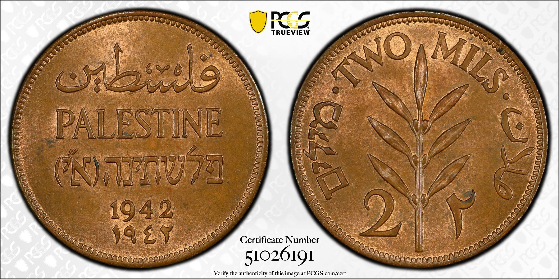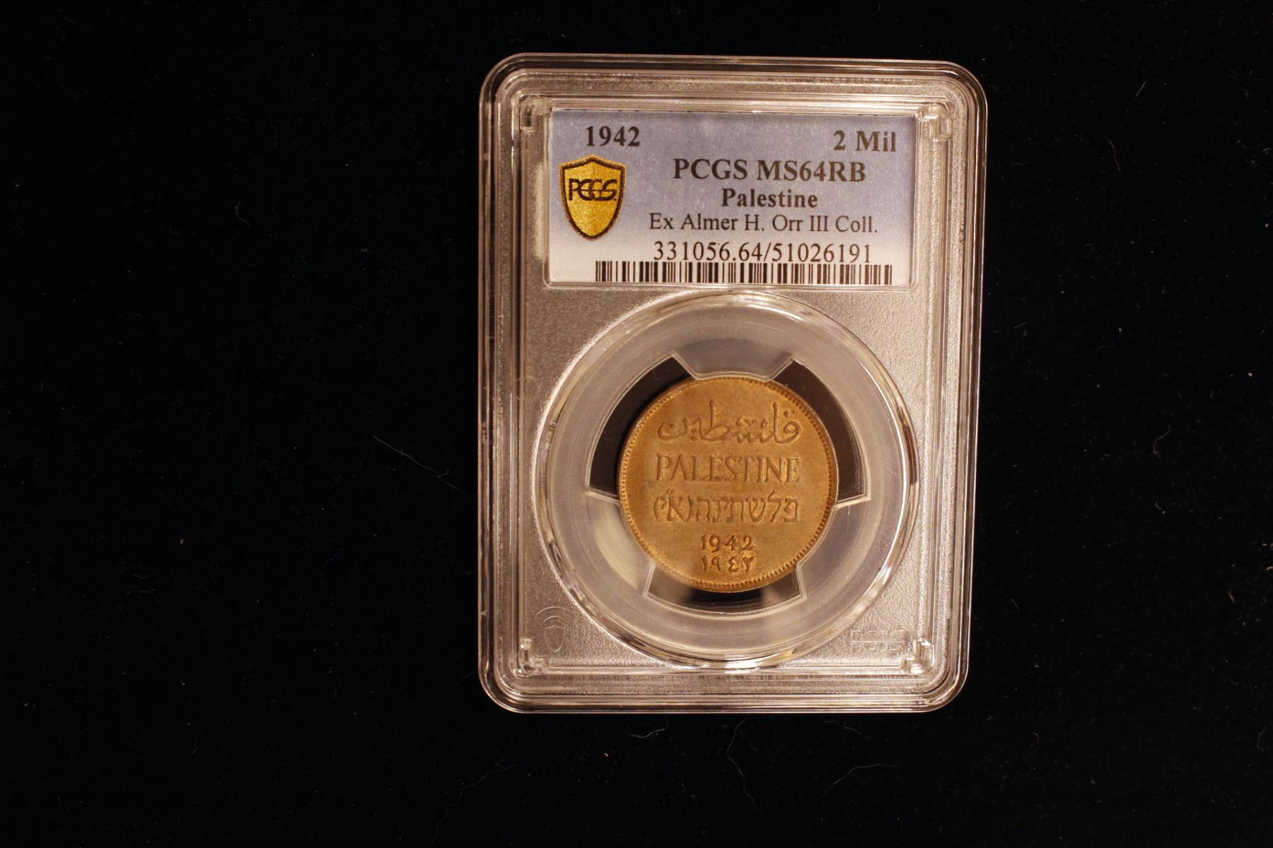 PALESTINE: British Mandate, AE 2 mils, 1942, KM-2, a wonderful example, PCGS graded MS64 RB, ex Almer H. Orr III Collection.