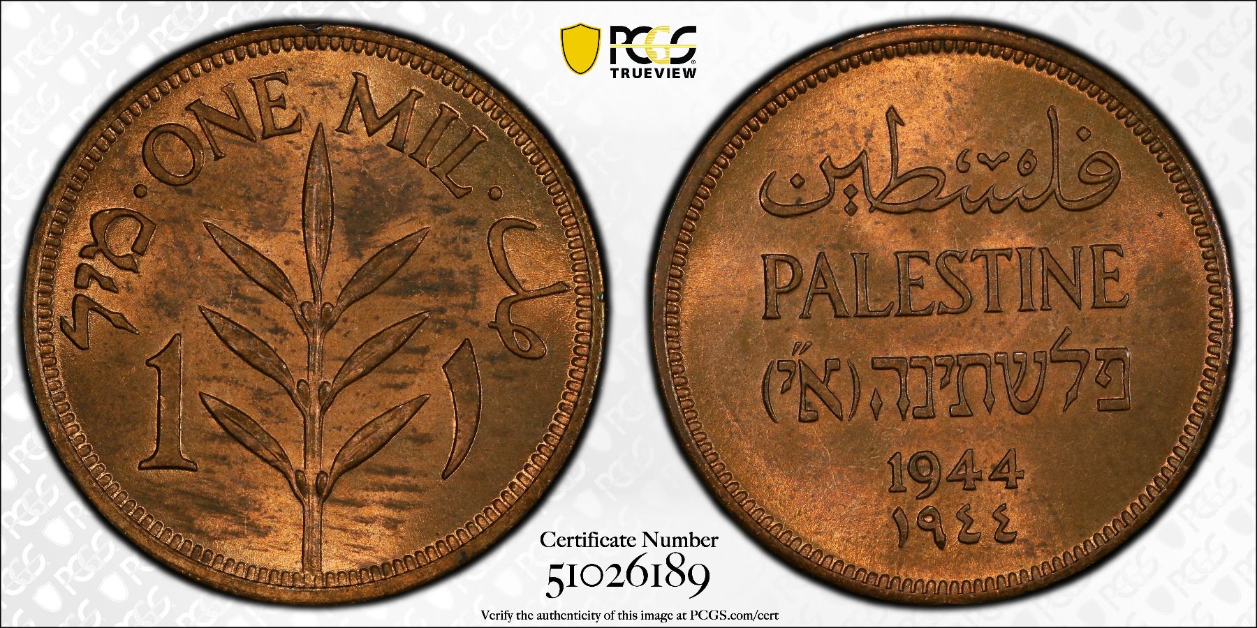 PALESTINE: British Mandate, AE mil, 1944, KM-1, a wonderful example, PCGS graded MS64 RB, ex Almer H. Orr III Collection.