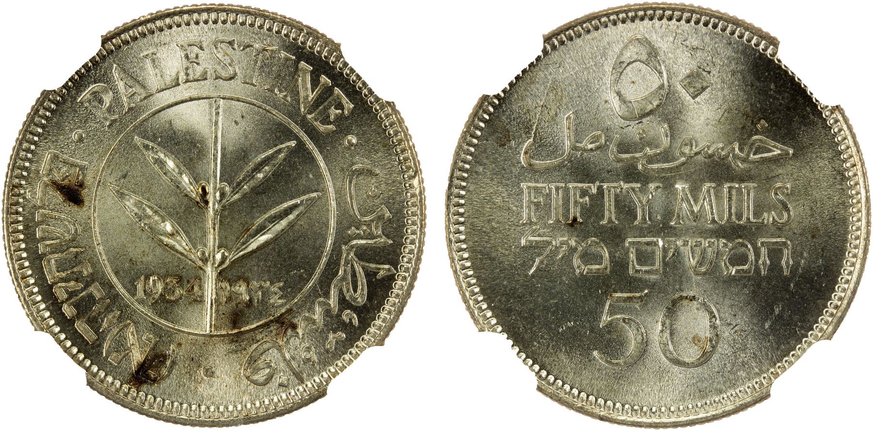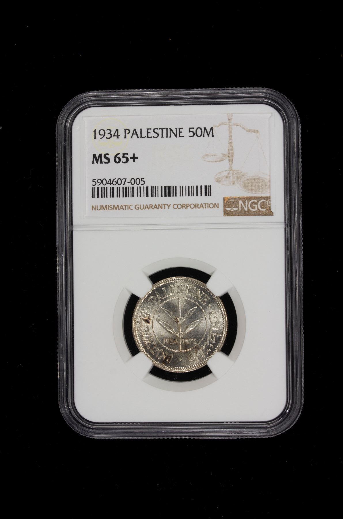 PALESTINE: British Mandate, AR 50 mils, 1934, KM-6, magnificent specimen, only two graded higher by NGC; rare date, NGC graded MS65+, R.