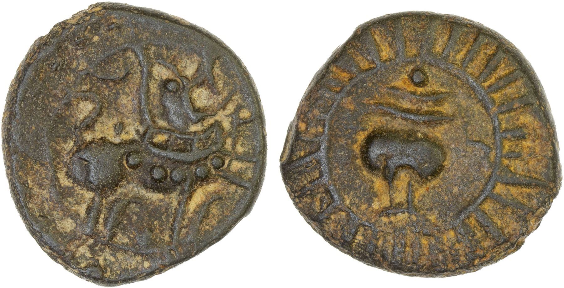 PALLAVAS OF KANCHI: Anonymous, potin unit (7.16g), ca. 400-675, Mitch-TK-258-60, Tamil Nadu coinage, humped bull standing right // sankha shell within radiant margin, attractive bold details, Choice VF.