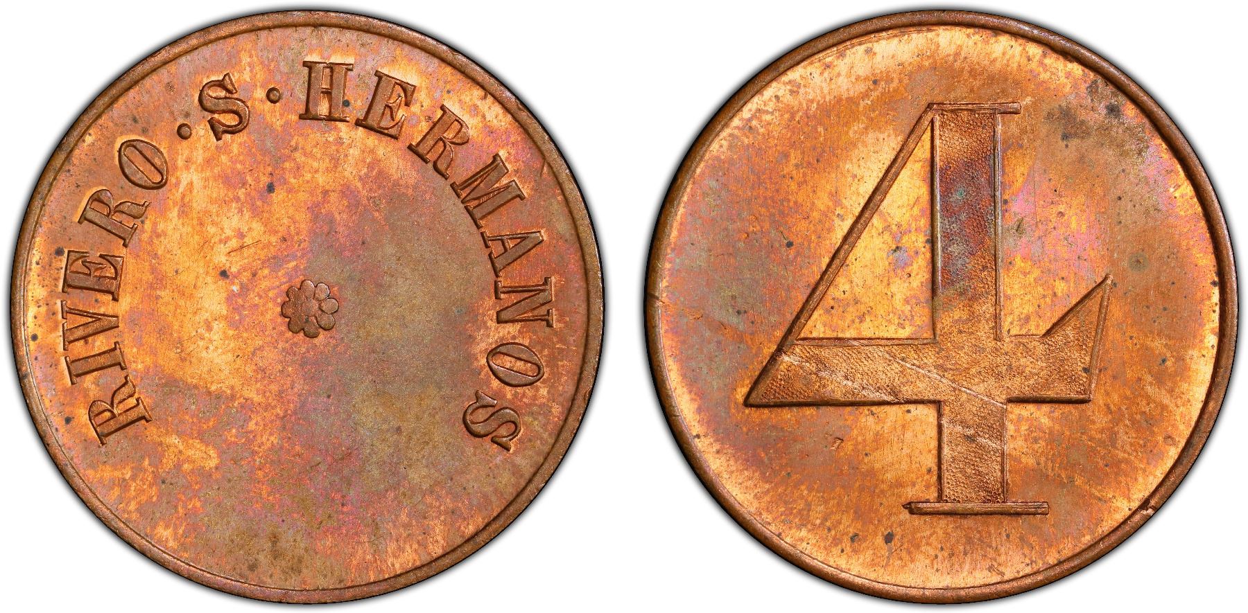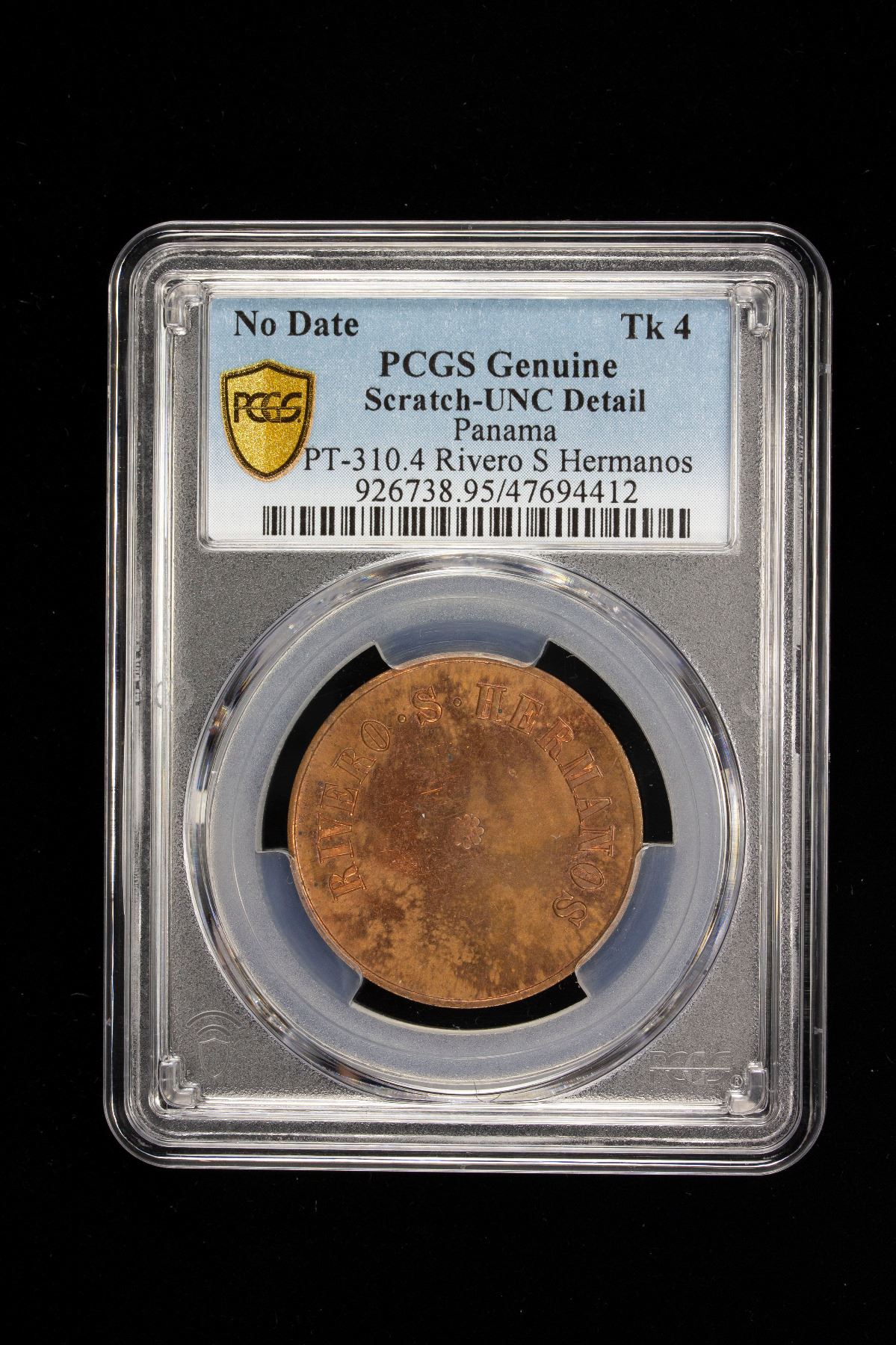 PANAMA: AE 4 reales token, ND, PT-310.4, RIVERO S HERMANOS // large numeral "4" at center, light scratch, a prooflike mint state example, PCGS UNC Details, ex Dr. Axel Wahlstedt Collection. This example was part of an old collection from Sweden of likely specimen strikes or sample coins due to the high quality of the strike and condition of the token. Likely struck in Germany by a currently unknown private mint.