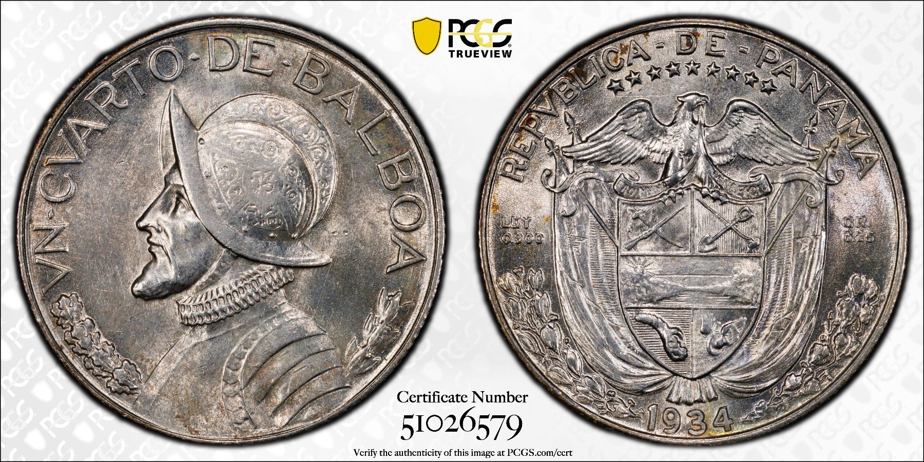 PANAMA: Republic, AR 1/4 balboa, 1934, KM-11.1, an attractive nearly mint state example, PCGS graded AU58.