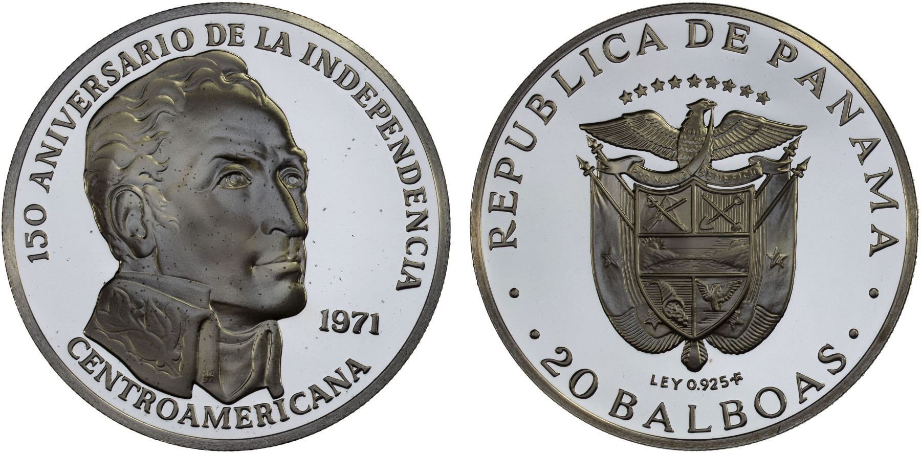 PANAMA: Republic, AR 20 balboas, 1971, KM-29, 150th Anniversary of Central American Independence, in original box with COA, Choice Proof.