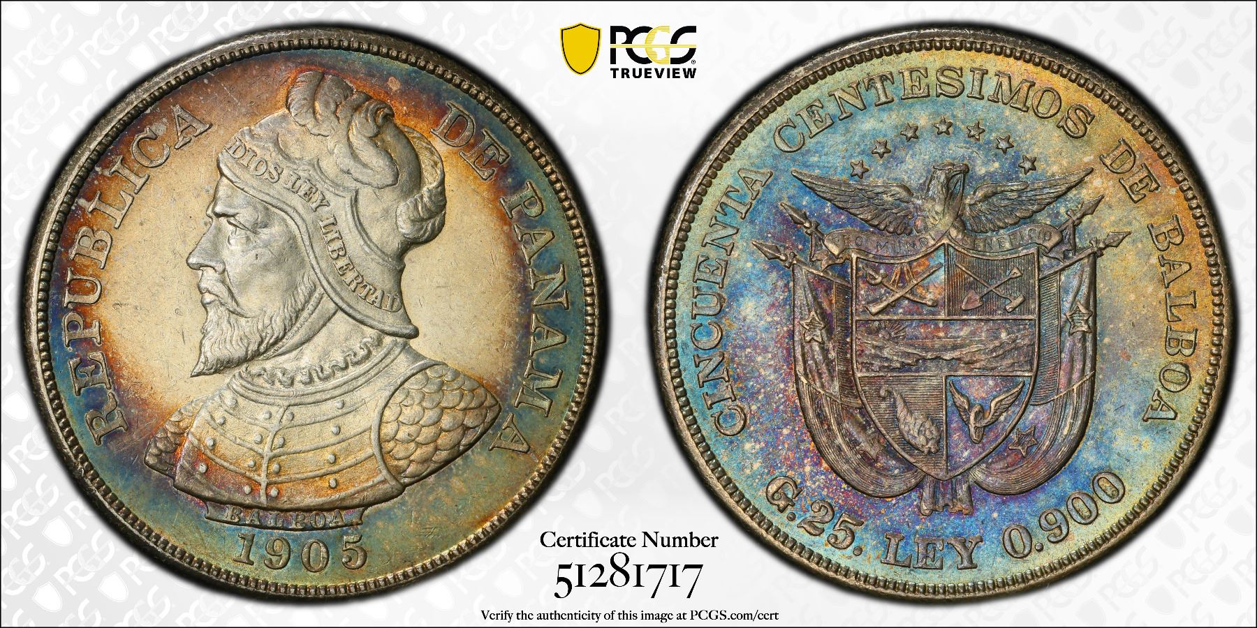 PANAMA: Republic, AR 50 centesimos, 1904, KM-5, an attractive toned nearly mint state example, PCGS graded AU58.