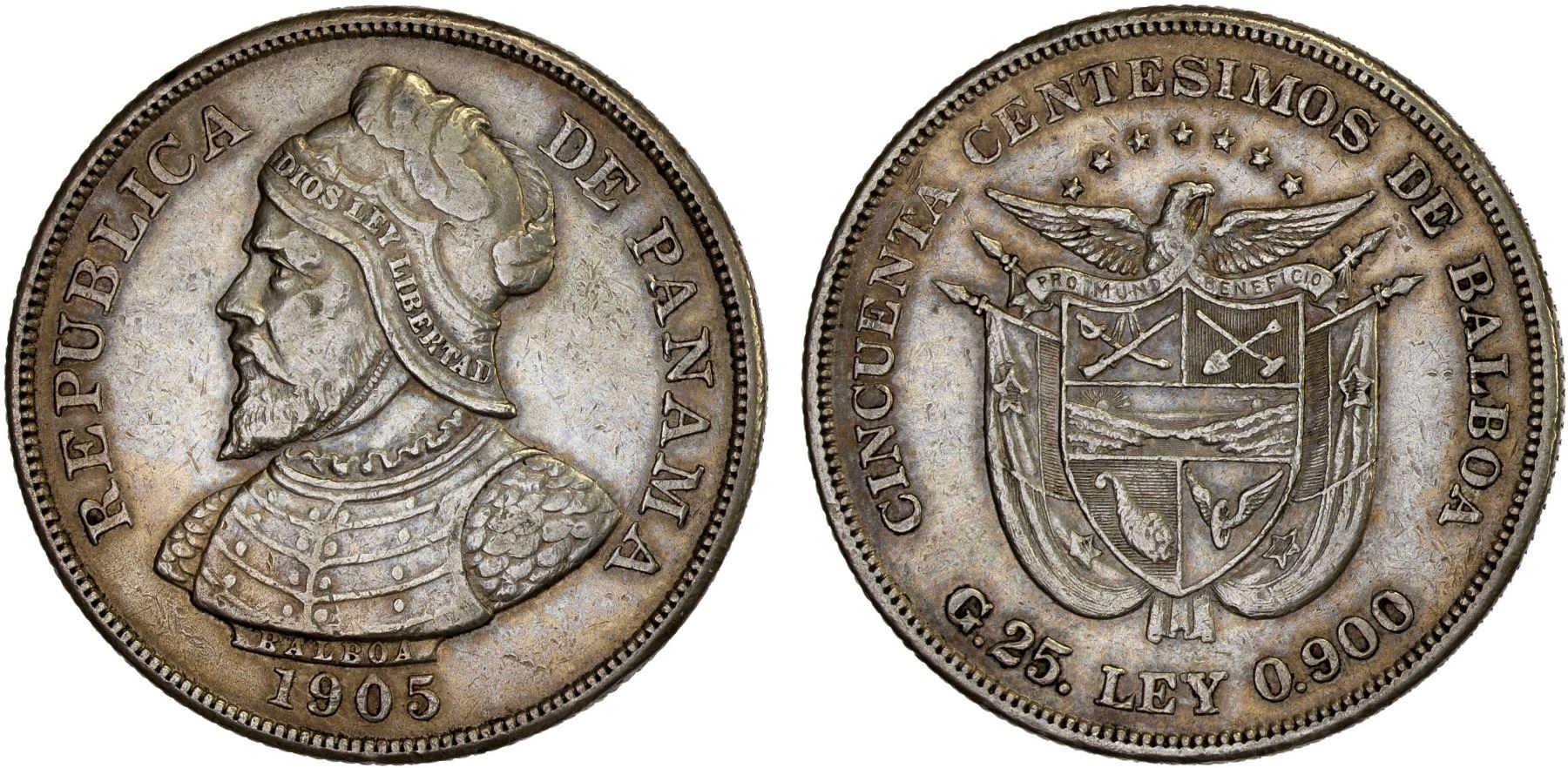 PANAMA: Republic, AR 50 centesimos, 1905, KM-5, lightly toned, better date of the two-year type, Choice VF.