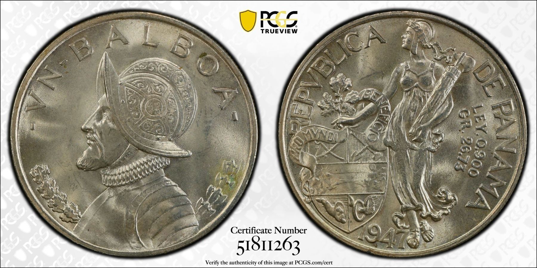 PANAMA: Republic, AR balboa, 1947, KM-13, a superb example, PCGS graded MS65.