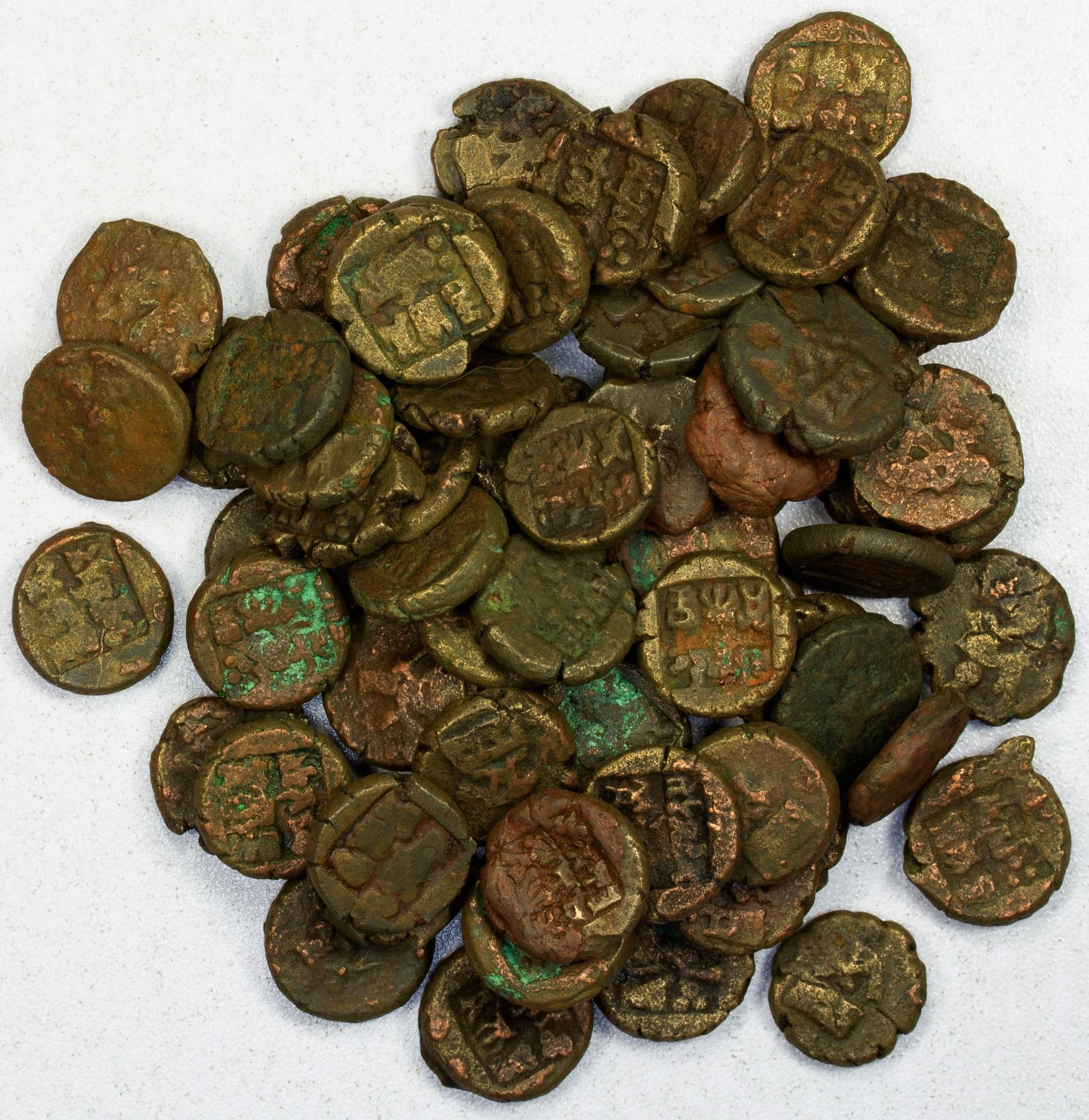 PANCHALA OF AHICHHATRA: Indramitra, 1st century AD, LOT of 68 AE units, Pieper-1339/40, all with king's name indramitrasa in Brami below three Panchala symbols // king on pedestal, holding vajra; most with complete name and figure of the king, some partially obscured due to weak strike, centering, double striking; VG-F to F-VF conditions, all with light to moderate porosity; retail value $1000, lot of 68 pieces.