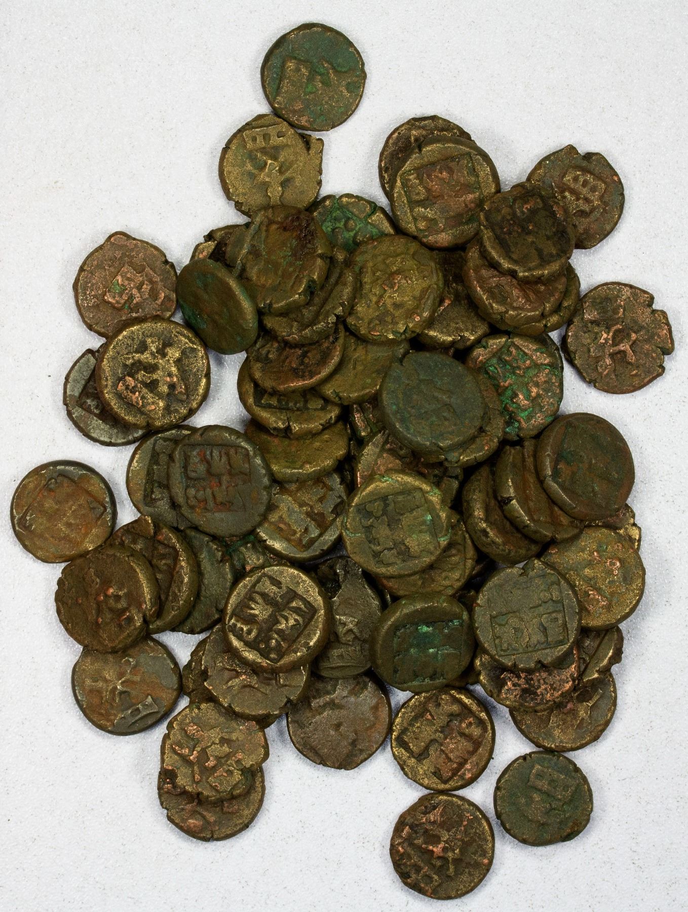 PANCHALA OF AHICHHATRA: Indramitra, 1st century AD, LOT of 68 AE units, Pieper-1339/40, all with king's name indramitrasa in Brami below three Panchala symbols // king on pedestal, holding vajra; most with complete name and figure of the king, some partially obscured due to weak strike, centering, double striking; VG-F to F-VF conditions, all with light to moderate porosity; retail value $1000, lot of 68 pieces.