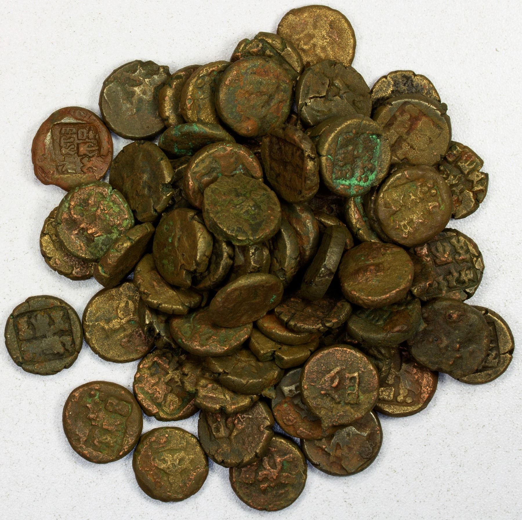 PANCHALA OF AHICHHATRA: Indramitra, 1st century AD, LOT of 69 AE units, Pieper-1339/40, all with king's name indramitrasa in Brami below three Panchala symbols // king on pedestal, holding vajra; most with complete name and figure of the king, some partially obscured due to weak strike, centering, double striking; VG-F to F-VF conditions, all with light to moderate porosity; retail value $1000, lot of 69 pieces.