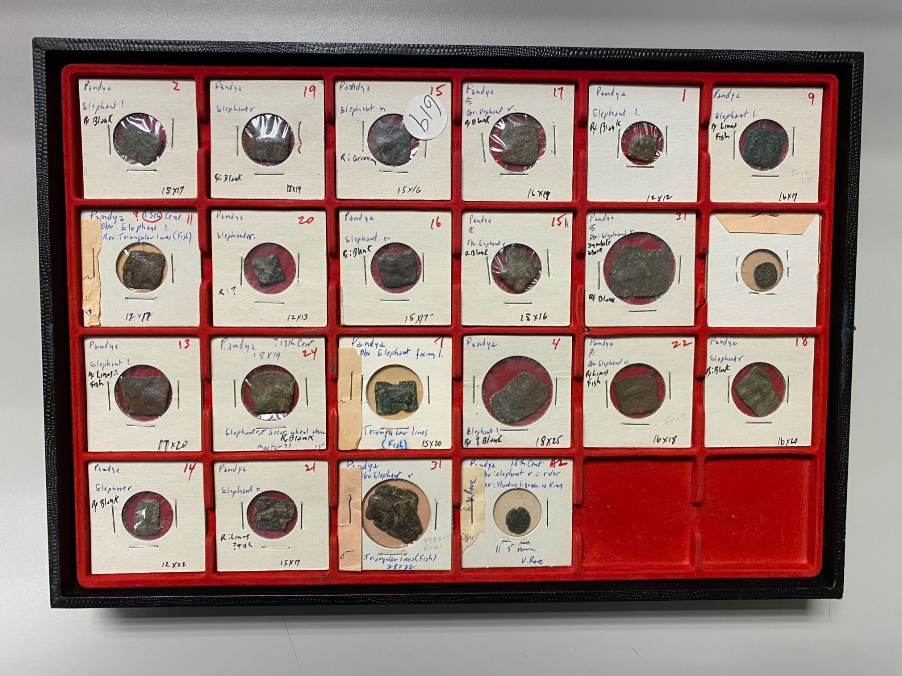 PANDYAS: LOT of 22 copper coins, many different types, many used in Ceylon, all with elephant on one side; average Fair to VG; with at least partial identification by the consignor; retail value $400, lot of 22 pieces.