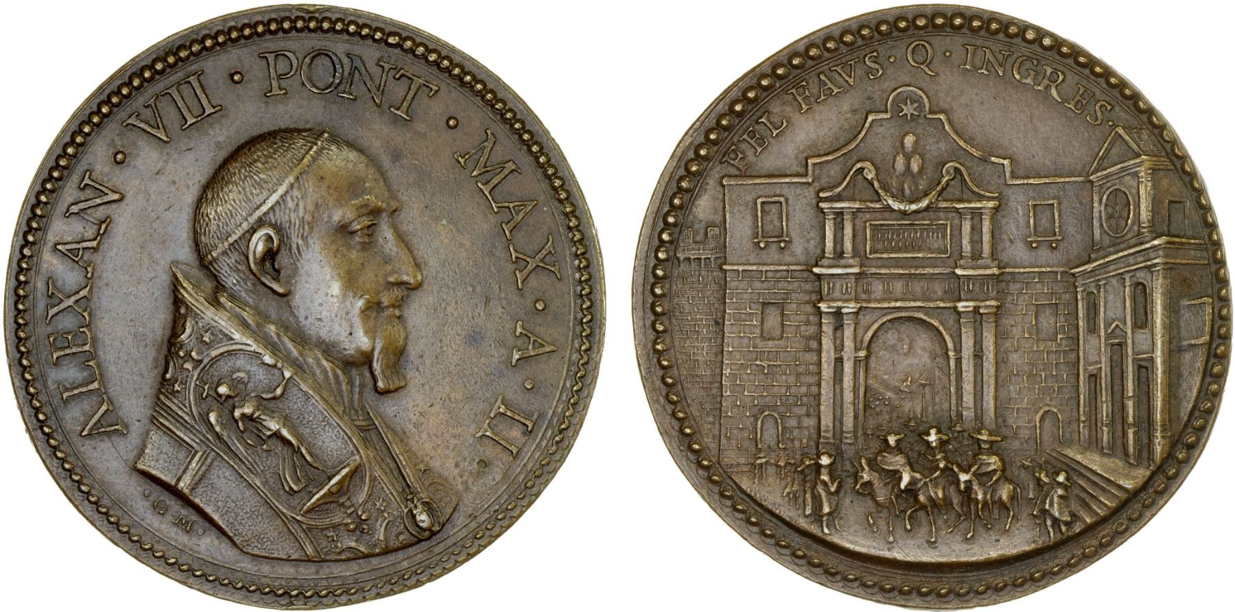 PAPAL STATES: Alessandro VII, 1655-1667, AE medal (14.86g), 1656, Bartolotti-E657//E656, 35mm bronze medal mule for the Ceremonial Entry of the Swedish Queen Christina into Rome on December 23, 1665 by Gaspare Morone Mola, bust right wearing a zucchetto and clerical vestments with ALEXAN VII PONT MAX A II around // Christina and two cardinals ride into the city of Rome through the Porta del Popolo with FEL FAVS Q INGRES around, obverse of Bartoletti-E657 and reverse of E656, brown, plain edge, XF.