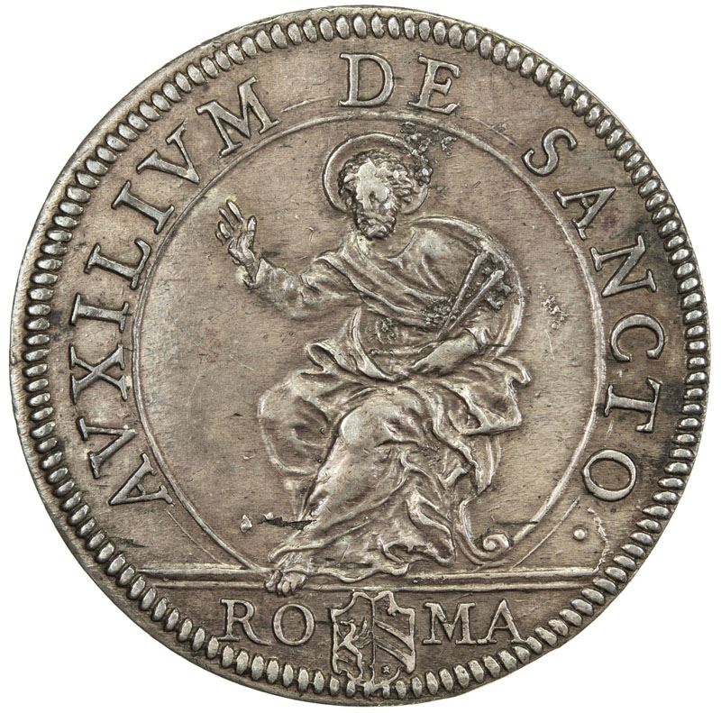 PAPAL STATES: Clement IX, 1667-1669, AR testone (9.58g), Rome, ND, CNI-16, coat of arms // St. Peter seated left, raising hand in benediction, superb strike, delightfully toned, choice EF.