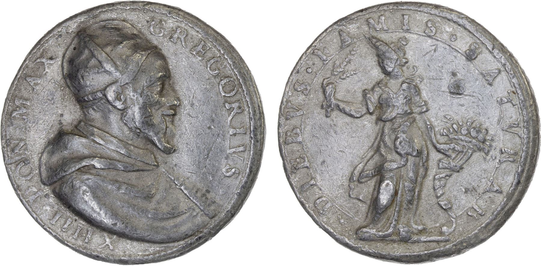 PAPAL STATES: Gregorius XIV, 1590-1591, medal (19.22g), ND, as Spink-823, 34mm white metal medal of Gregory XIV by Niccolò de Bonis, bust with right camauro and mozzetta with GREGORIVS - XIIII PON MAX around, Annona standing facing with head left, holding ears of corn and cornucopia with DIEBVS FAMIS SATVRAB, plain edge, VF.