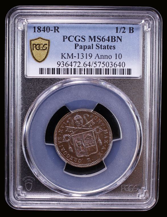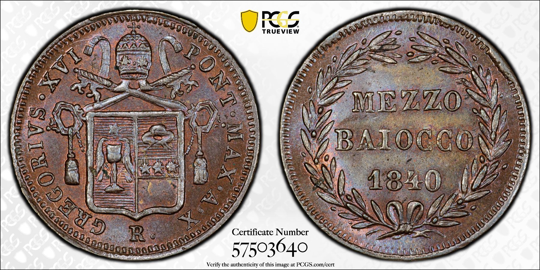 PAPAL STATES: Gregory XVI, 1831-1846, AE 1/2 (mezzo) baiocco, 1840-R year X, KM-1319, some red, beautiful bluish tone, PCGS graded MS64 BN.