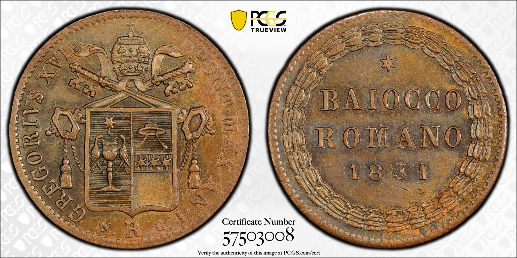 PAPAL STATES: Gregory XVI, 1831-1846, AE baiocco, 1831-R year I, PCGS MS63 BN