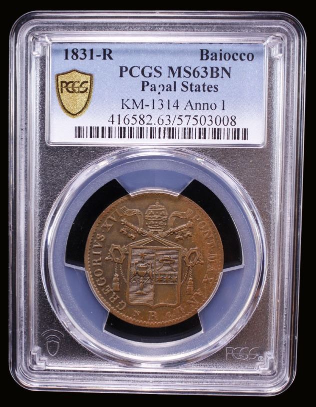 PAPAL STATES: Gregory XVI, 1831-1846, AE baiocco, 1831-R year I, KM-1314, two-year type, lightly toned, PCGS graded MS63 BN.