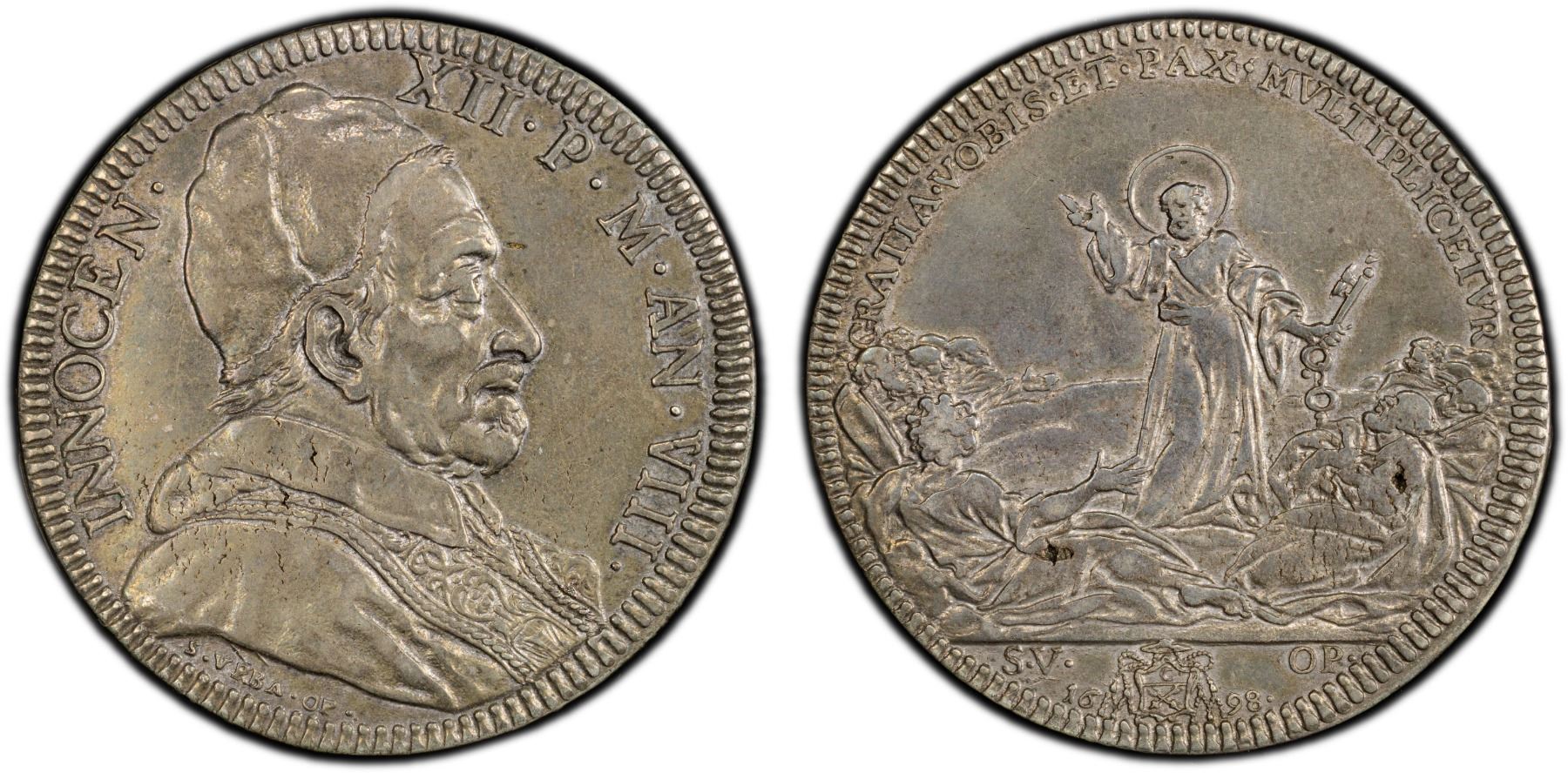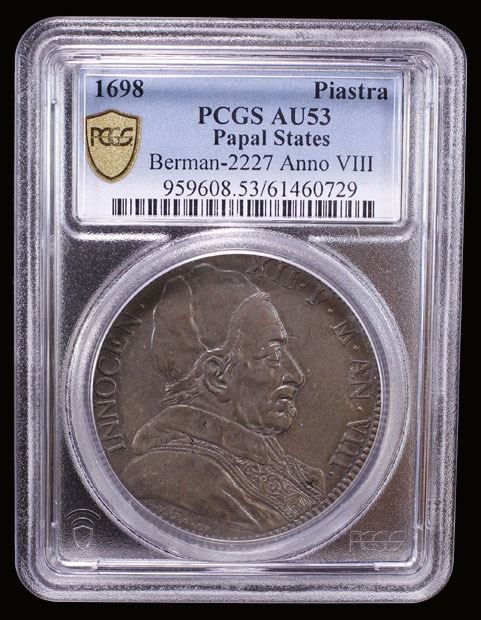PAPAL STATES: Innocent XII, 1691-1700, AR piastra (scudo of 80 bolognini), 1698 year VIII, PCGS AU53