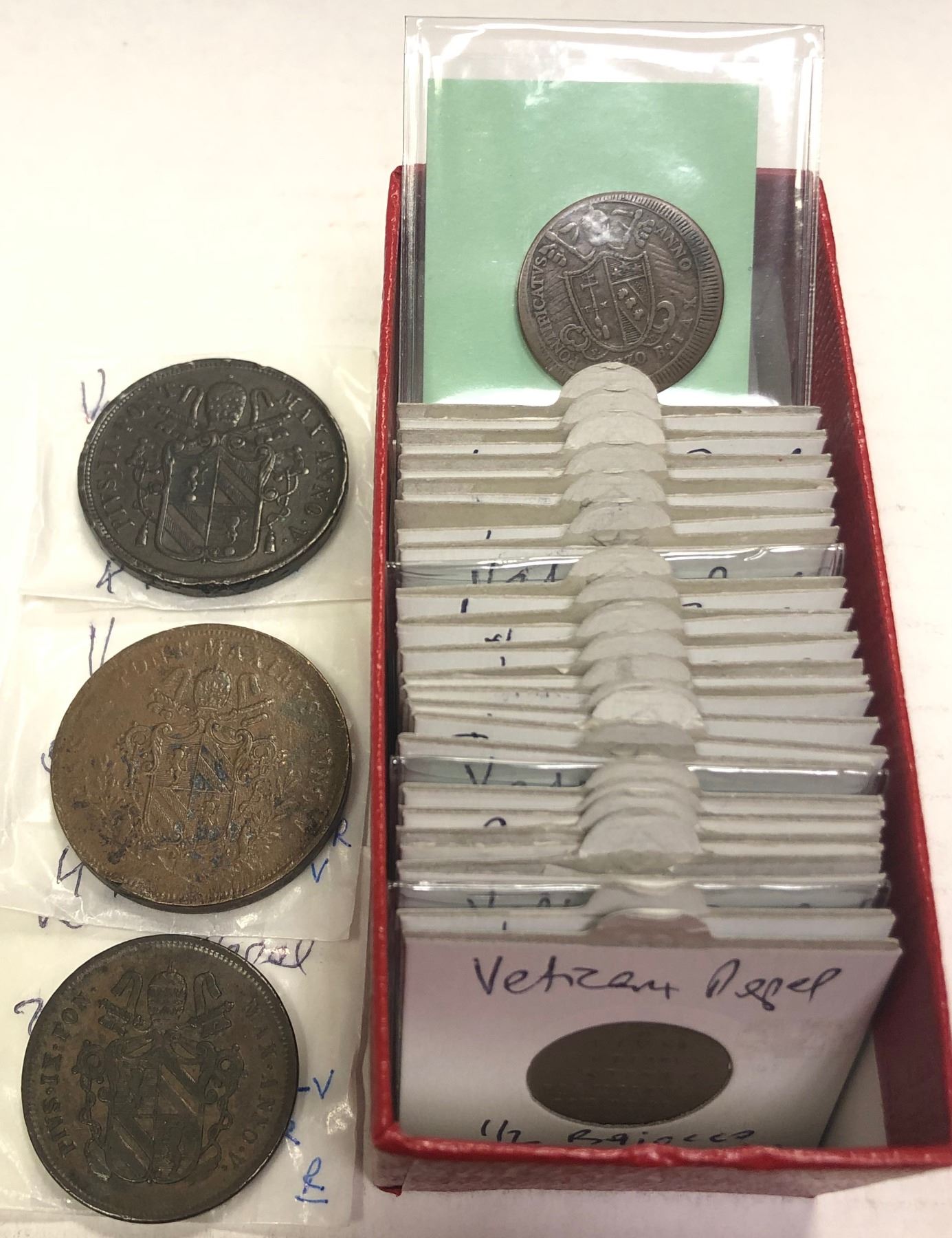 PAPAL STATES:LOT of 28 copper coins: ½ baiocco: 1801, 1802, 1816-R XVI, 1816-R XVII, 1816-B XVII, 1822, 1824, 1826, 1829-R Choice AU, 1833, 1838-B, 1847-B EF, and 1851-B VI; baiocco: ND (1797), 1801 KM-1263 (2 pcs), 1802, 1816-R XVI, 1829, 1831, 1835-R, 1846-R S, 1849-R/R Choice AU a few dark spots R, and 1851-R VI; 2 baiocchi: 1848-R and 1851-B/R V R; and 5 baiocchi: 1850-R V KM-1346 and 1851-B V; lots of different types, attributed in consignor's 2x2 holders, average circulated grades, except as noted, retail value $825, lot of 28 pieces, ex Wolfgang Schuster Collection.