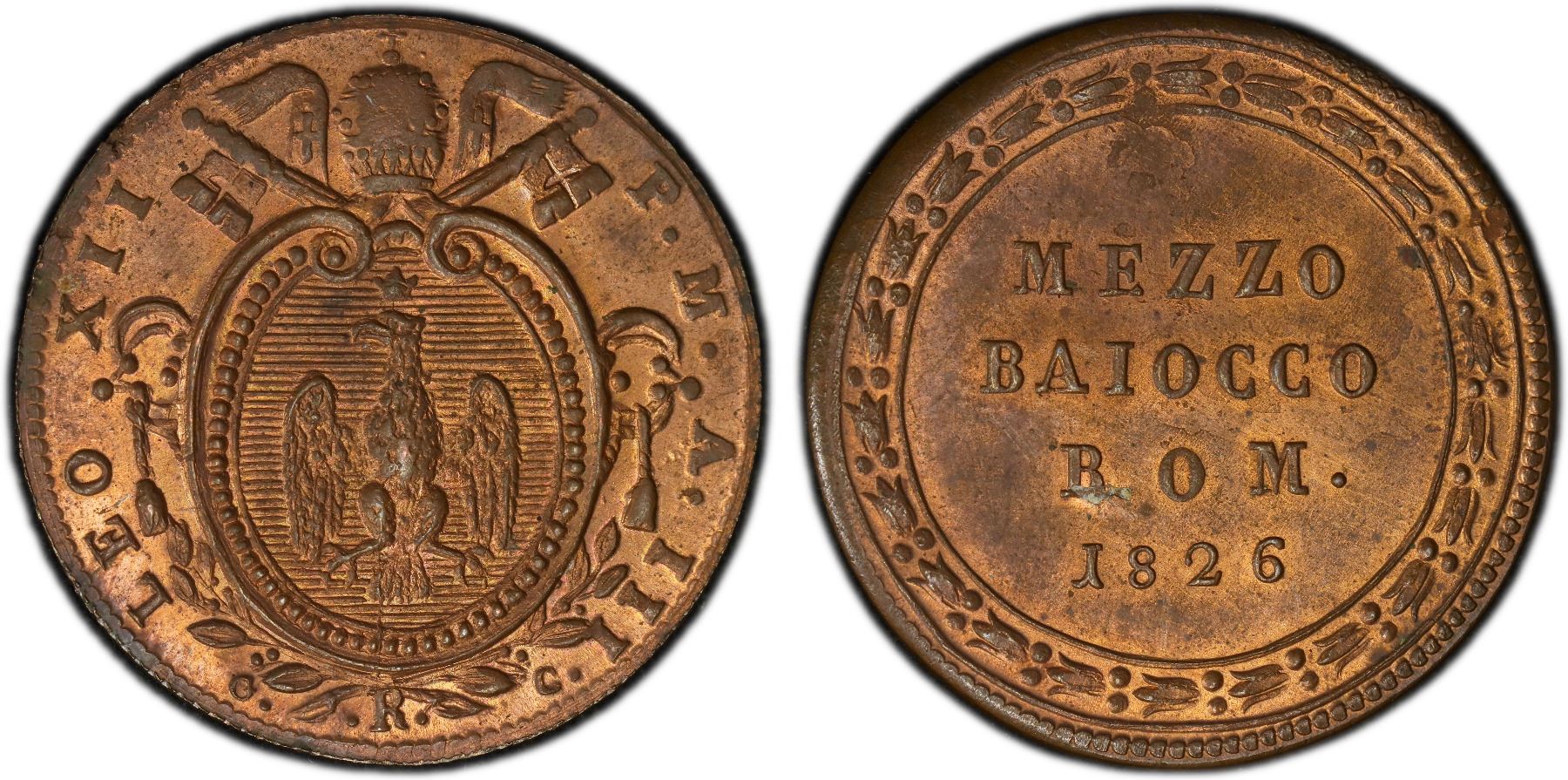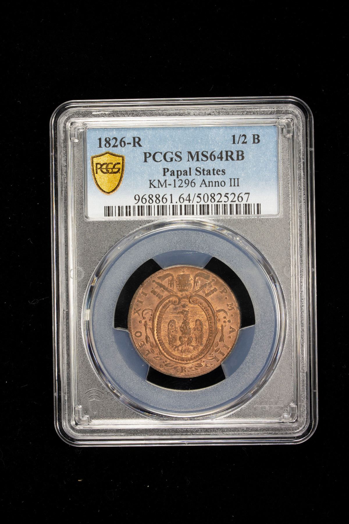 PAPAL STATES: Leo XII, 1823-1829, AE 1/2 baiocco, Rome, 1826 year III, KM-1296, a wonderful lustrous caramel red-brown mint state example! PCGS graded MS64 RB. The sole finest graded example at PCGS (Top Pop).