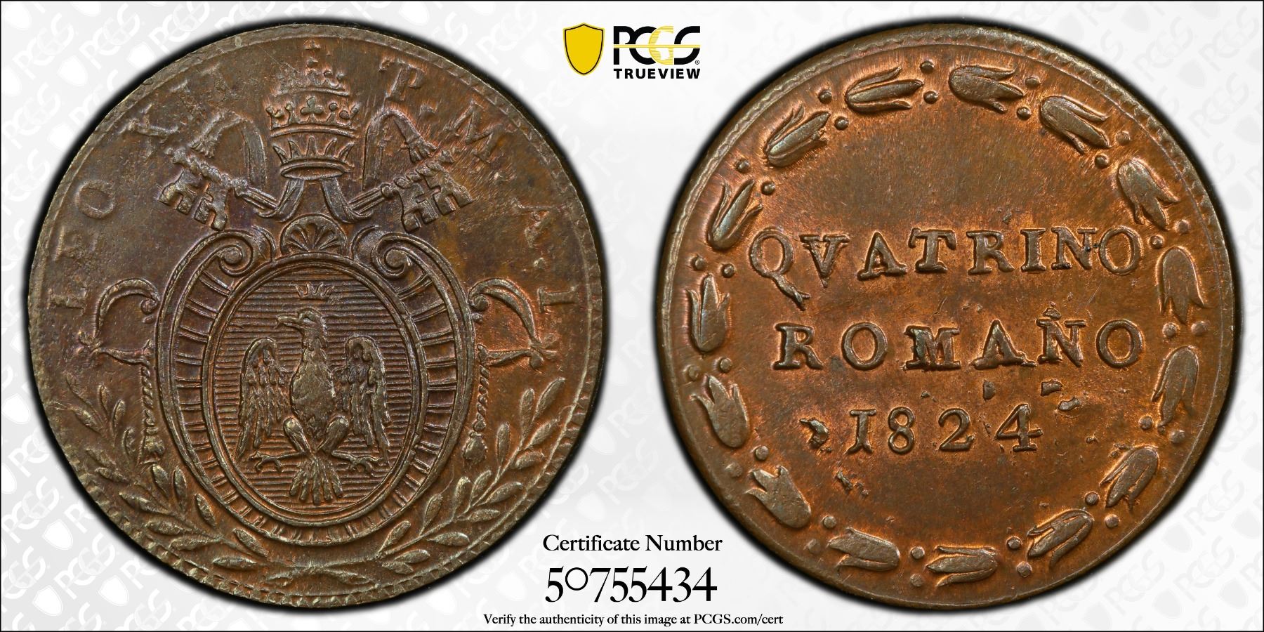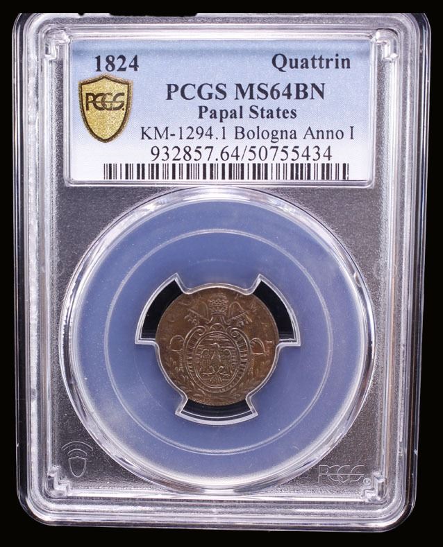 PAPAL STATES: Leo XII, 1823-1829, AE quattrino, Bologna, 1824, PCGS MS64 BN