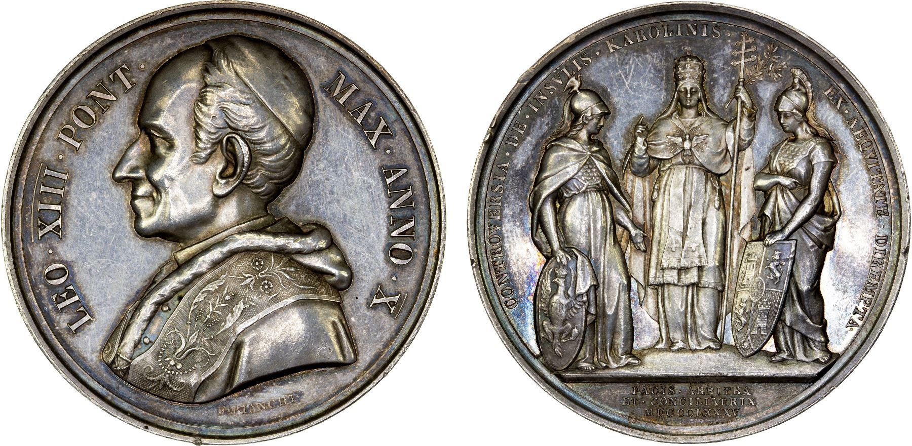 PAPAL STATES: Leo XIII, 1878-1903, AR medal (35.08g), 1885, Montenegro-62, 44mm silver medal for the Pope's Arbitration of the Conflict between Germany and Spain on the Carolinas Islands by Biancchi, anno X, bust left with LEO.XIII.PONT. MAX.ANNO.X around // the Church with Germania to left and Spain to right with CONTROVERSIA.DE.INSVLIS. KAROLINIS. EX.RQVITATE.DIREMPTA. around and PACIS.ARBITRA / ET.CONCILIATRIX / MDCCCLXXXV in exergue, hairlines, a few minor rim nicks, some toning, plain edge, XF