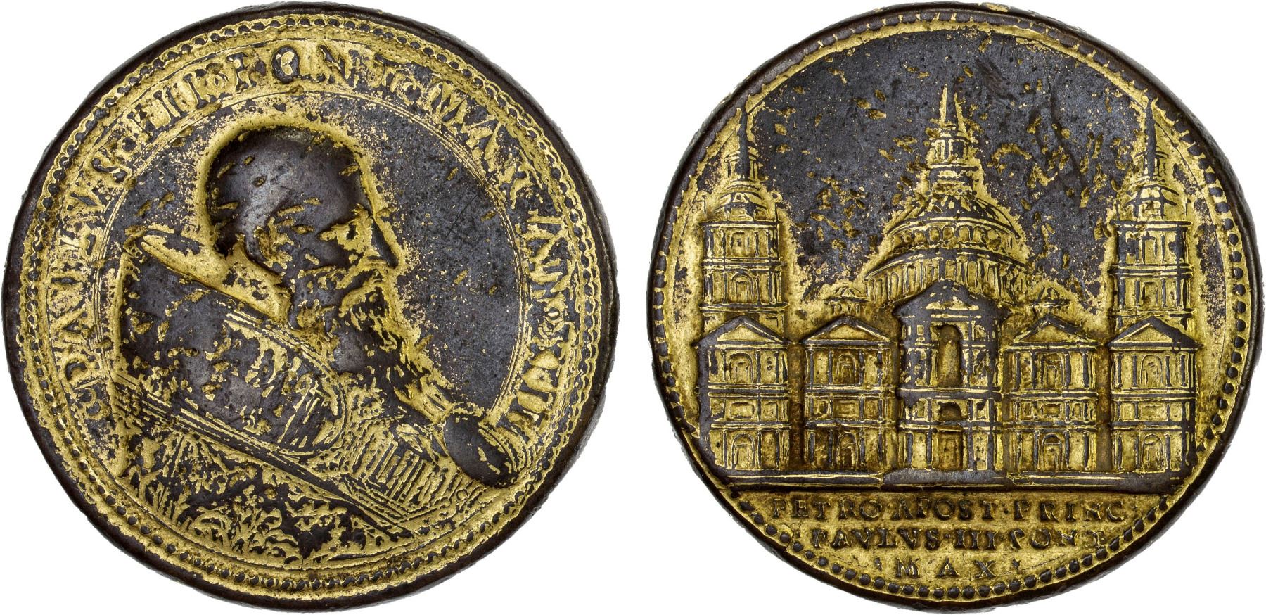 PAPAL STATES: Paul III, 1534-1579, gilt AE medal (42.32g), year XIII, 42mm cast gilt bronze medal by Alessandro Cesati and Giangiacomo Bonzagni; PAVLVS III PONT MAX AN XIII, around bust right // PETRO APOST PRINC PAVLVS III PONT MAX, below the Basilica di San Pietro in the project of the architect Antonio da Sangall, a later cast medal, VF.