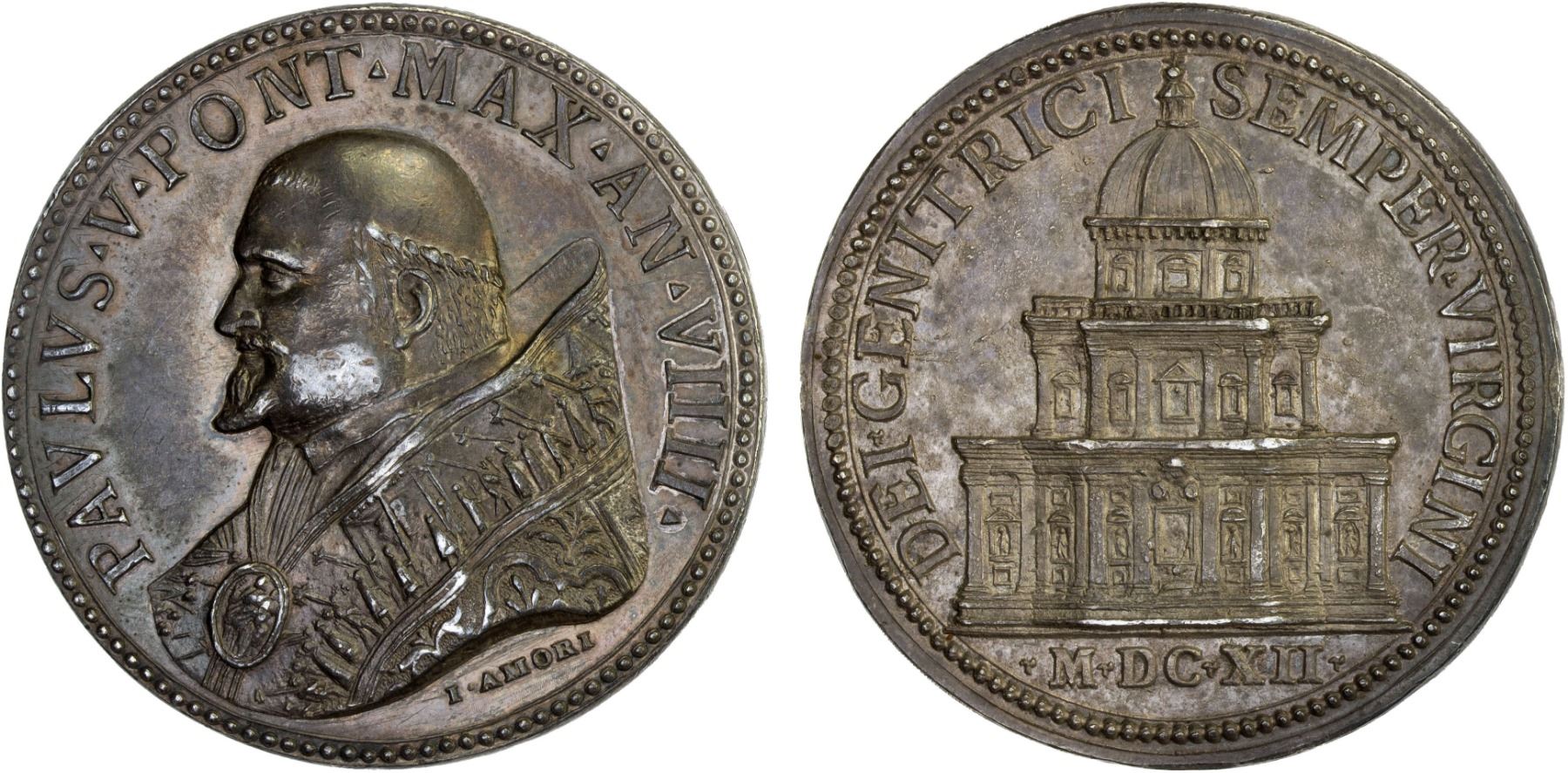 PAPAL STATES: Paul V, 1605-1621, AR medal (26.56g), 1612, Lincoln-898, Bartolotti-E 612, 38mm silver medal for the Completion of the Cappella Paolina by A. Mori, bust left with PAULVS V PONT MAX AN VIIII around // facing view of the chapel with DEI GENITRICI - SEMPER VIRGINI around and M DC XII in exergue, lightly toned, very light obverse tooling, light reverse die rust, slight evidence of double striking on obverse, plain edge, XF-AU.
