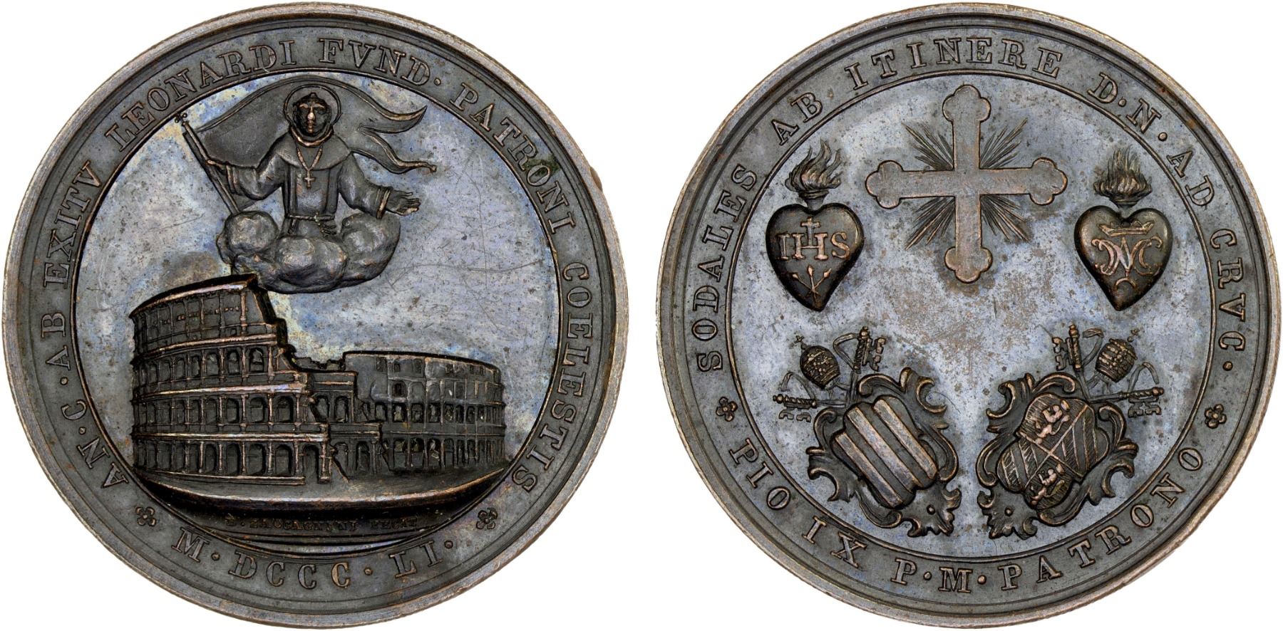 PAPAL STATES: Pio IX, 1846-1878, AE medal (28.31g), 1851, Bartolotti-V, 11; 37mm bronze medal of the Via Crusis at the Colosseum and the 100th Anniversary of the Death of Saint Leonard of Porto Maurizio, view of the Colosseum with Saint Leonard floating above with AN C AB EXITV LEONARDE FVND PATRONI COELESTIS - M.CCC.LI around // crucifix between two burning hearts, with the two coats of arms of Benedict XIV and Pius IX below, with SODALES AB ITINERED N AD CRVC - PIO IX P M PATRONO around, a few faint scratches in obverse field, plain edge, XF.