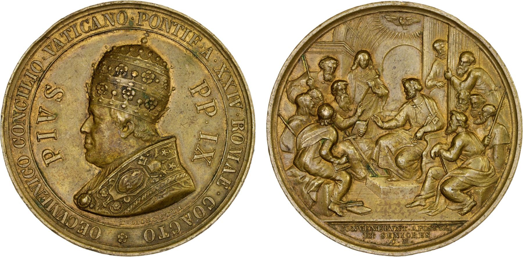 PAPAL STATES: Pio IX, 1846-1878, AE medal (37.43g), 1869, Bartolotti-XXIV, 11; 43mm gilt brass medal for the Concilio Ecumenico by C. Moscetti, bust left with tiara with OECVMENICO CONCILIO VATICANO PONTIF A XXIV ROMAE COACTO // PIVS - PP IX around // St. Peter at the First Apostolic Council with CONVENERVNT APOSTOLI / ET SENIORES in exergue, most of gilding worn away, plain edge, XF.