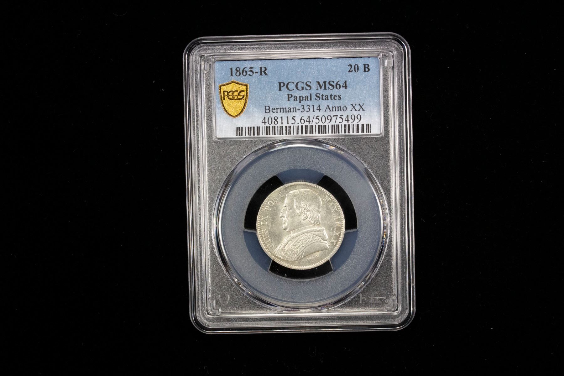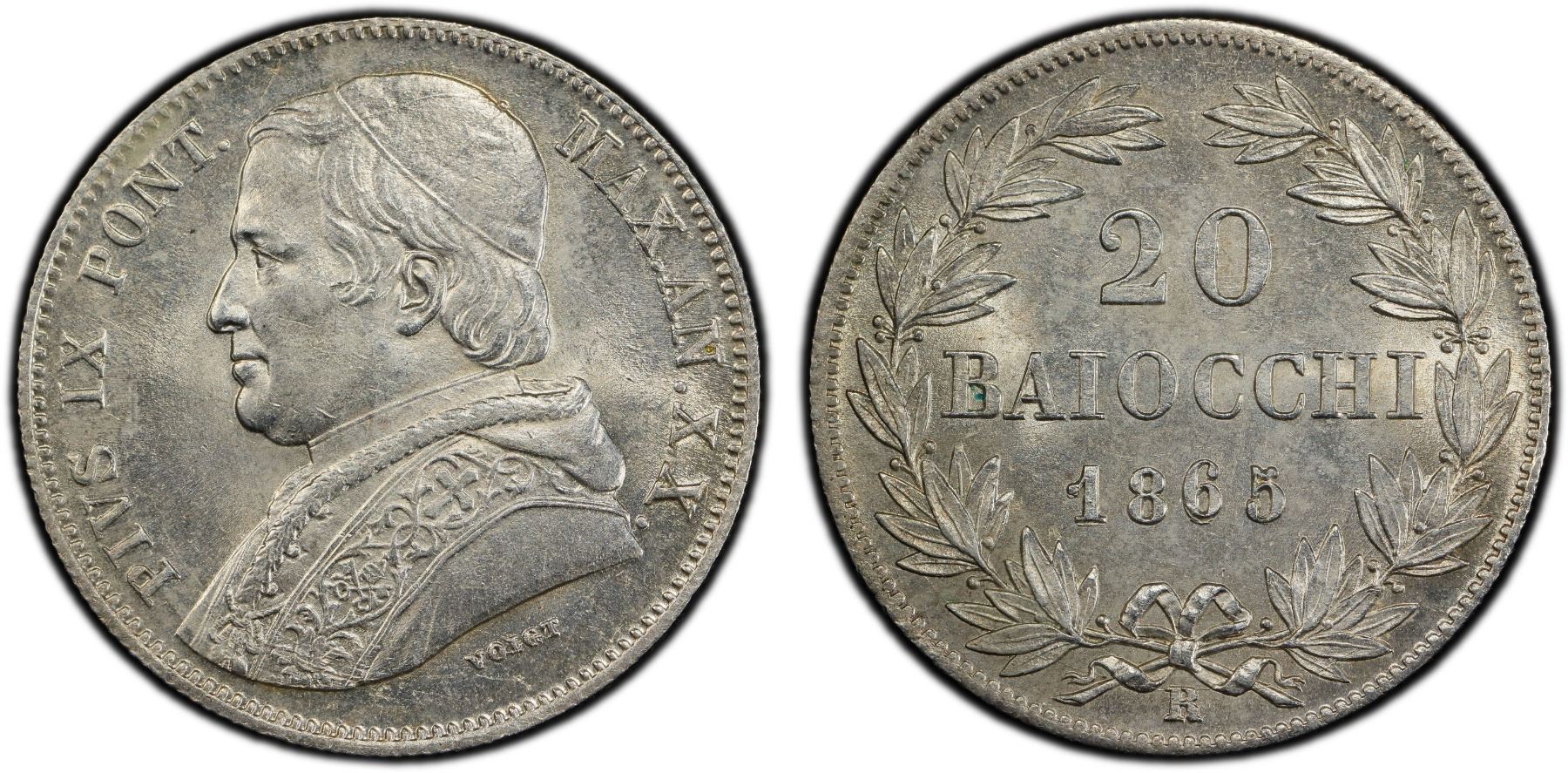 PAPAL STATES: Pius IX, 1846-1870, AR 20 baiocchi, 1865-R year XX, KM-1360a, a wonderful mint state example! PCGS graded MS64.