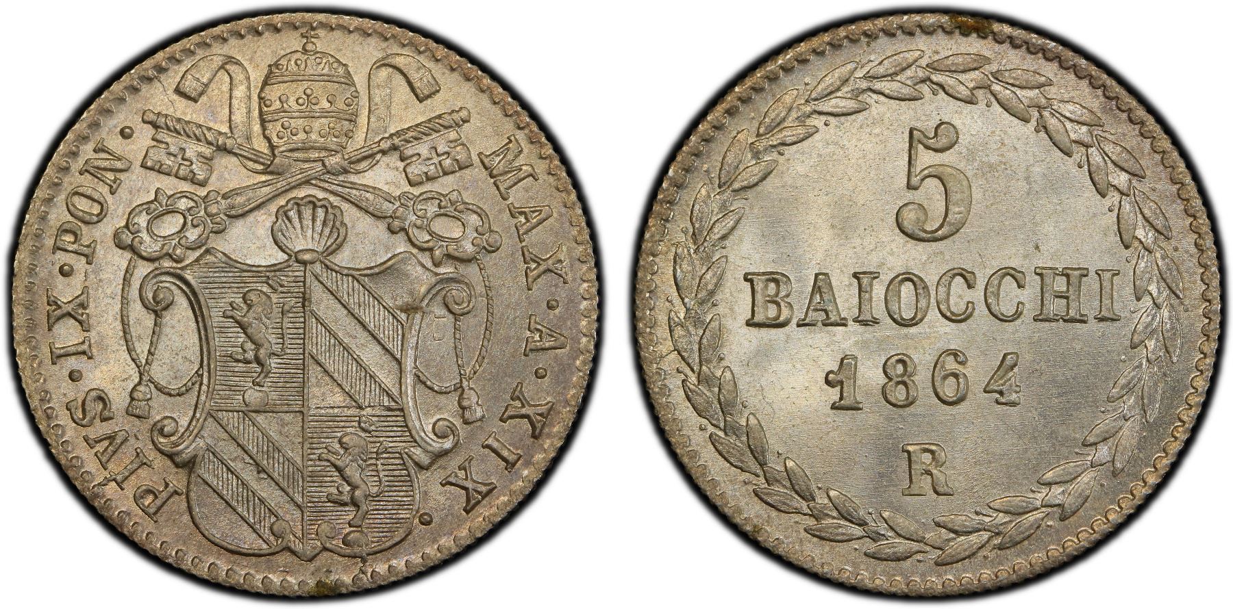 PAPAL STATES: Pius IX, 1846-1870, AR 5 baiocchi, 1864-R year XIX, PCGS MS67