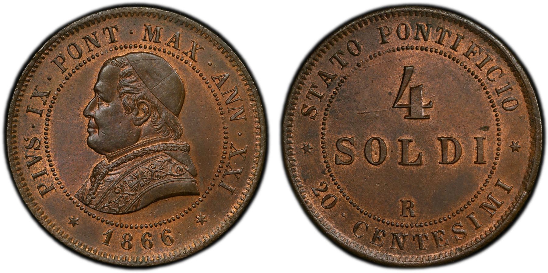 PAPAL STATES: Pius IX, 1846-1878, AE 4 soldi / 20 centesimi, 1866-R year XXI, PCGS MS64 RB
