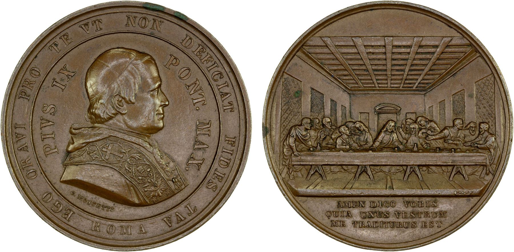 PAPAL STATES: Pius IX, 1846-1878, AE medal (17.22g), ND (1848), 37mm bronze medal by Carlo Moscetti & Carl Stubenrauch; PIVS IX / PONT. MAX around bust of Pope right, C. MOSCETTI. below, EGO ORAVI PRO TE VT NON DEFICIAT FIDES TVA / ROMA around in outer legend // "Presentation of the Last Supper" by Leonardo Da Vinci, AMEN DICO VOBIS / QUIA UNUS VESTRUM / ME TRADITURUS EST in exergue, C.S.F. at base of image, AU.